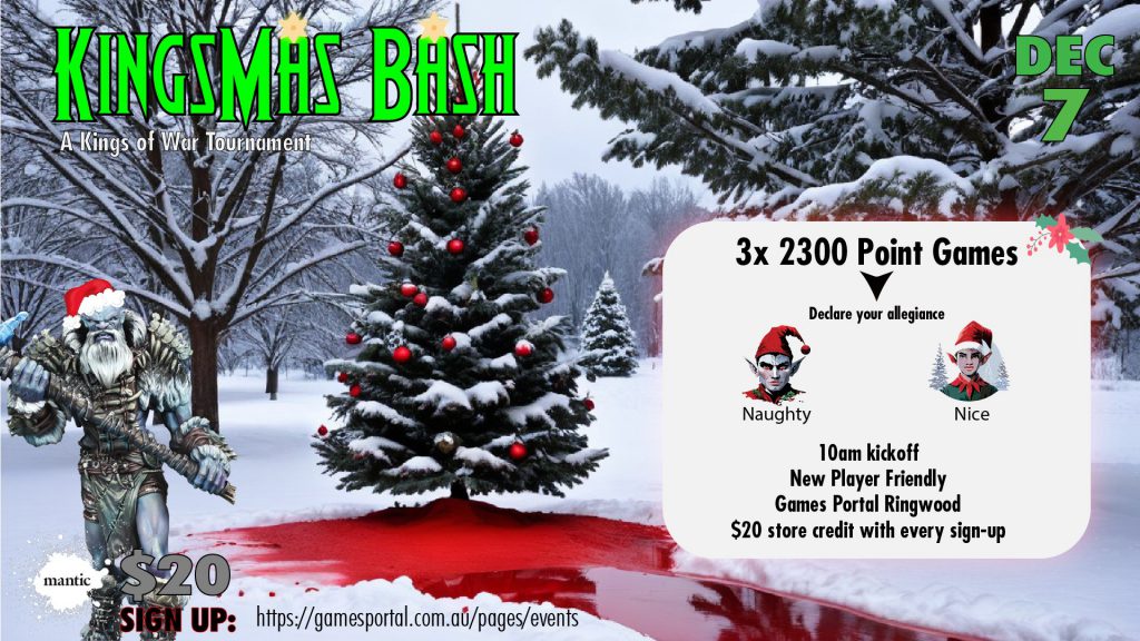 The generosity and camaraderie of the Kings of War community is legendary, and I saw this firsthand when I announced the Kingsmas Bash in December. Support came from all directions.- Graphic designer Mathew Sellick hit me up the very next day to get a promotional poster put together and even made the Facebook event.