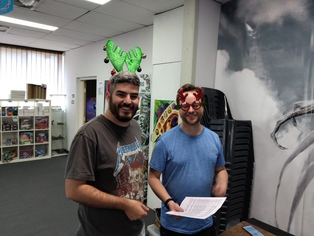 The prize in question was the $50 voucher for Pathfinder Gaming, which I had hidden in one of 16 Christmas cards. Every player got to pick one Christmas card and open it up for a chance to win. I managed to write a Kings of War-themed Christmas greeting in each of them, which got a laugh. Next time I might get them professionally done, but for now I was pleased I could make so many greetings (all of which have vacated my brain by time of writing, sorry!).