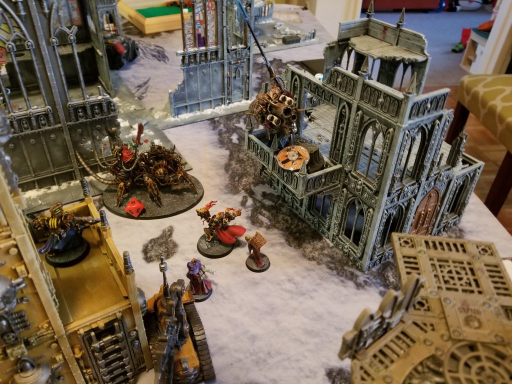 One of the key abilities in play this game was the Council of Traitors Stratagem for the Black Legion, from Vigilus Ablaze. For 1 CP, I can give a Sorcerer and a Dark Apostle in the army each a Warlord Trait. I gave the Sorcerer the Warp Lord trait to help his casts, and the Dark Apostle the Trusted War-Leader trait, allowing me to get back CP every time I use a Stratagem on a D6 roll of 5+. Over the course of this game, it was worth an extra 3 CP for me, paying for itself and then some.