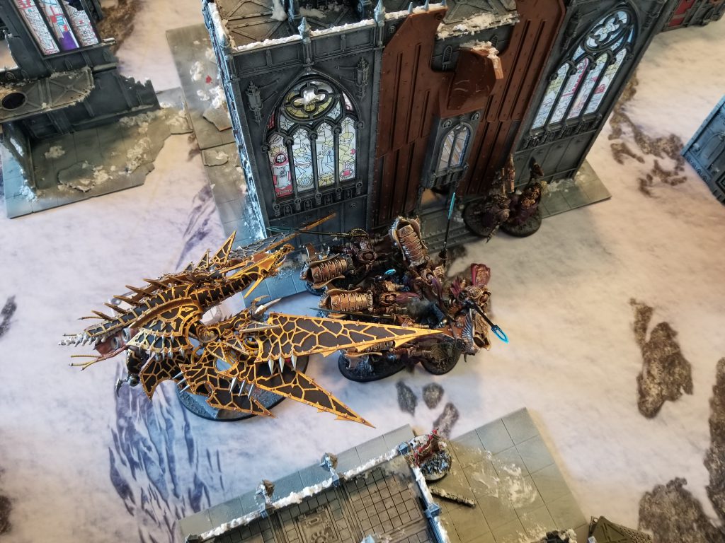 The Heldrake is here to tie up a unit on Turn 1. If he can trap the Bikers, then he can prevent them from charging something else for a turn, and if he also manages to kill one with his claws in melee, all the merrier. The Heldrake charges and, using the Daemonforge Stratagem, manages to put 3 Wounds on a Bike, but can't close the deal. On the plus side, the Bikes only do 2 damage back to it, leaving it alive to stall them for a turn.