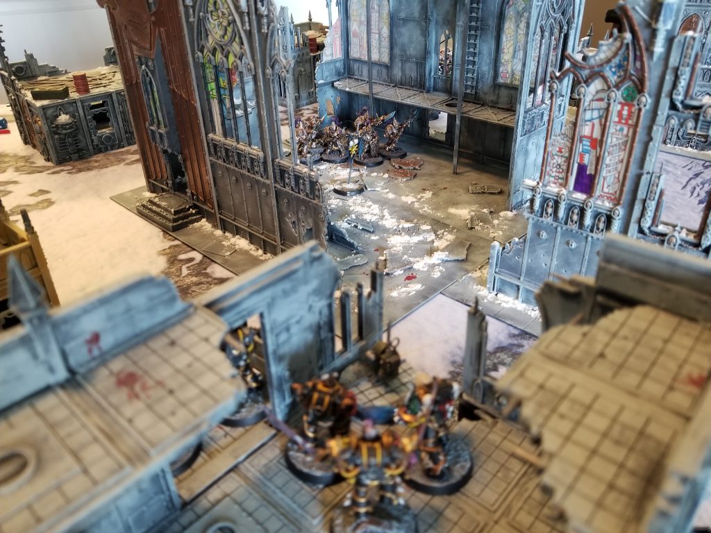 At this point, the Custodes needed a lot of help to pull out a win, but CSM had options. One thing he absolutely had to do was make sure his final Custodes bike ended up in my Deployment zone, so he could score the extra point from Linebreaker. He also needed to capture Objective IV, which meant taking out a squad of Cultists. Fortunately, he was able to kill 4 in the shooting phase and another 4 in the Fight phase, causing the remaining two to flee, scoring him an additional VP.