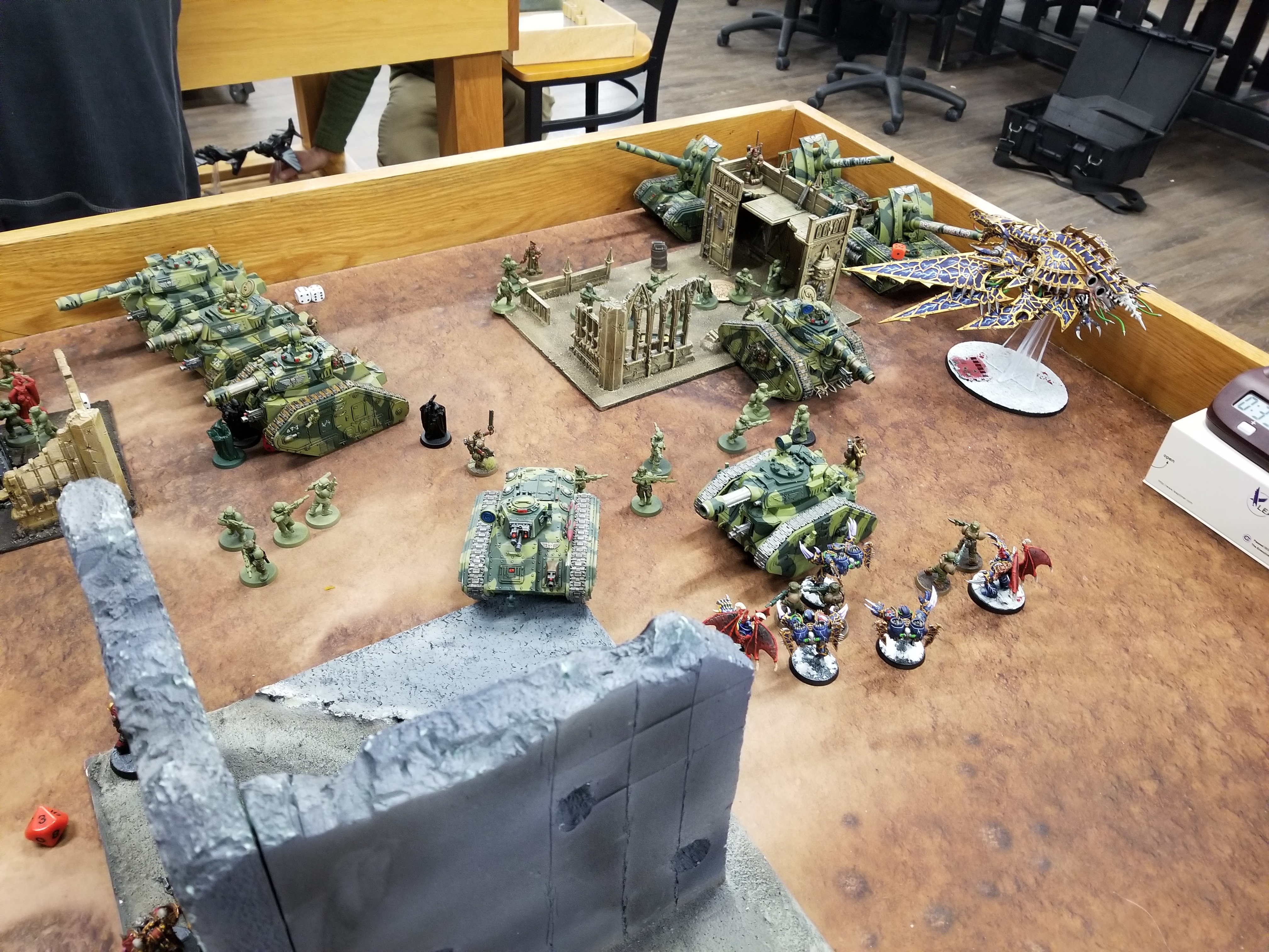 I started off by seizing, which was probably exactly what I needed. A lot of people are talking about how going second is better, actually right now and that's probably true for them in some games but here, in this triple-Basilisk hellscape, going first was a massive help. The biggest thing I needed to do early on was tie up vehicles, which I was only kind of able to do to prevent shooting. This was also a weird game in that my Heldrakes didn't really have any potent auras to turn off--the Master of Ordnance is probably the biggest one but even that isn't so massive. so instead I used them to touch tanks while using bolters to plow through guardsmen until the Warp Talons arrived.