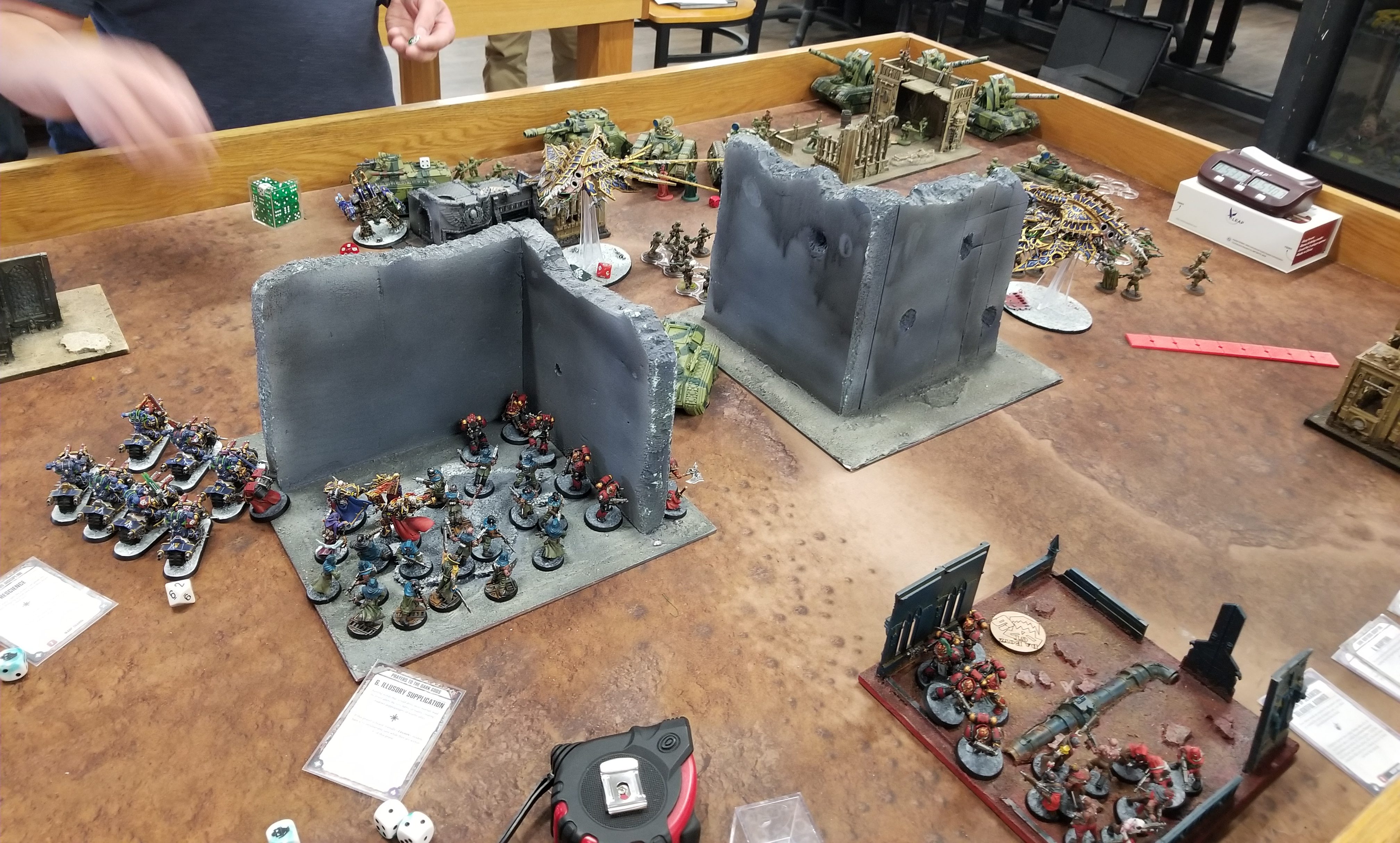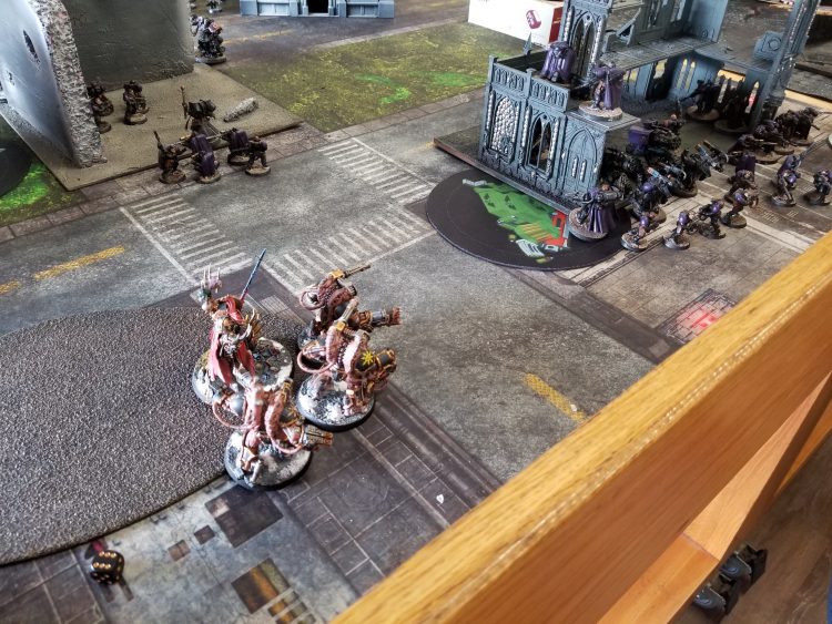 The Basilisks absolutely tore through me and ended up wiping my bikes off the table but the good news is that the Warp Talons did indeed put in work, able to repeatedly chew through Guard and force them to flee with stacked -2s to leadership, while also bad-touching tanks and using We Have Come For You to stay locked in combat with the characters and squads they touched, which also prevented the tanks from being able to shoot. This was a pretty close game through most of it, but it also ran real long, and ended up only playing 4 turns. Still, I was able to consistently hold more thanks to controlling the middle most of the game, and the Warp Talons helped me get a crucial kill more, plus I maxed out Reaper, and scored 3 each on Headhunters and Big Game Hunters, giving me the close win.