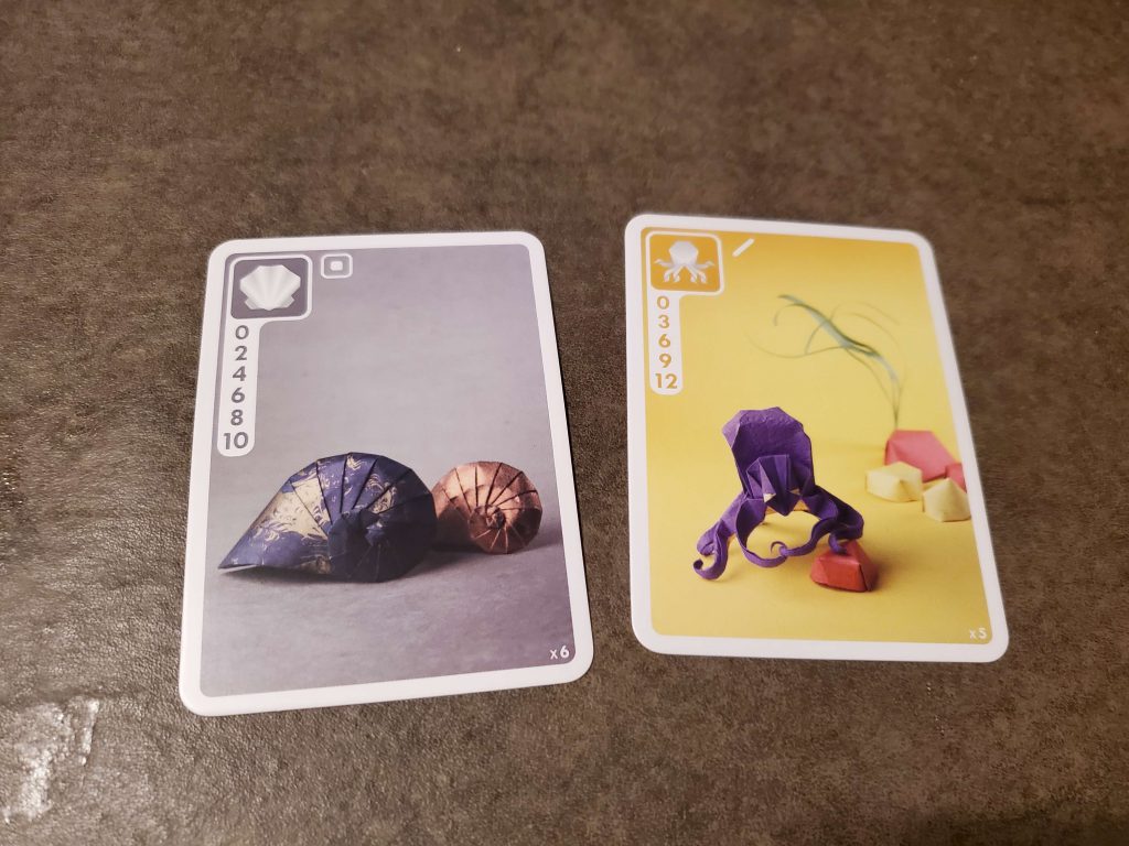 Artwork of Tomoko Fuse, Lucien Derainne, and Pierre-Yves Gallard shines throughout the deck.The Japanese art of origami paper is delicate and beautiful and has touched many cultures. You can find it all over Japan, obviously, and it is a common craft in the United States. Some cultures like to fold money into decorative pieces to give as gifts. When my kid was growing up, a book series based on origami Star Wars characters became the hot items at the Scholastic Book Fair. So why not put origami into a card game? Designers Bruno Cathala and Théo Rivière hired the talents of Lucien Derainne & Pierre-Yves Gallard, who folded a host of sea life and nautical objects and put them on colorful backgrounds to photograph for Sea Salt and Paper. They used the Color ADD alphabet to help colorblind folks enjoy the game, too, so if you struggle with the colors given in the game, there’s a handy card showing all the symbols for each color to help you out. Our group had a great time looking over the cards and deciphering the signs after we exclaimed over the art. The penguins alone are amazing! I also found out that the legendary Japanese origami pro Tomoko Fuse did the spiral, navel, and solid seashells, which are in a class all of their own. I want prints of some of these shells for my house. But let’s get back to the actual game.