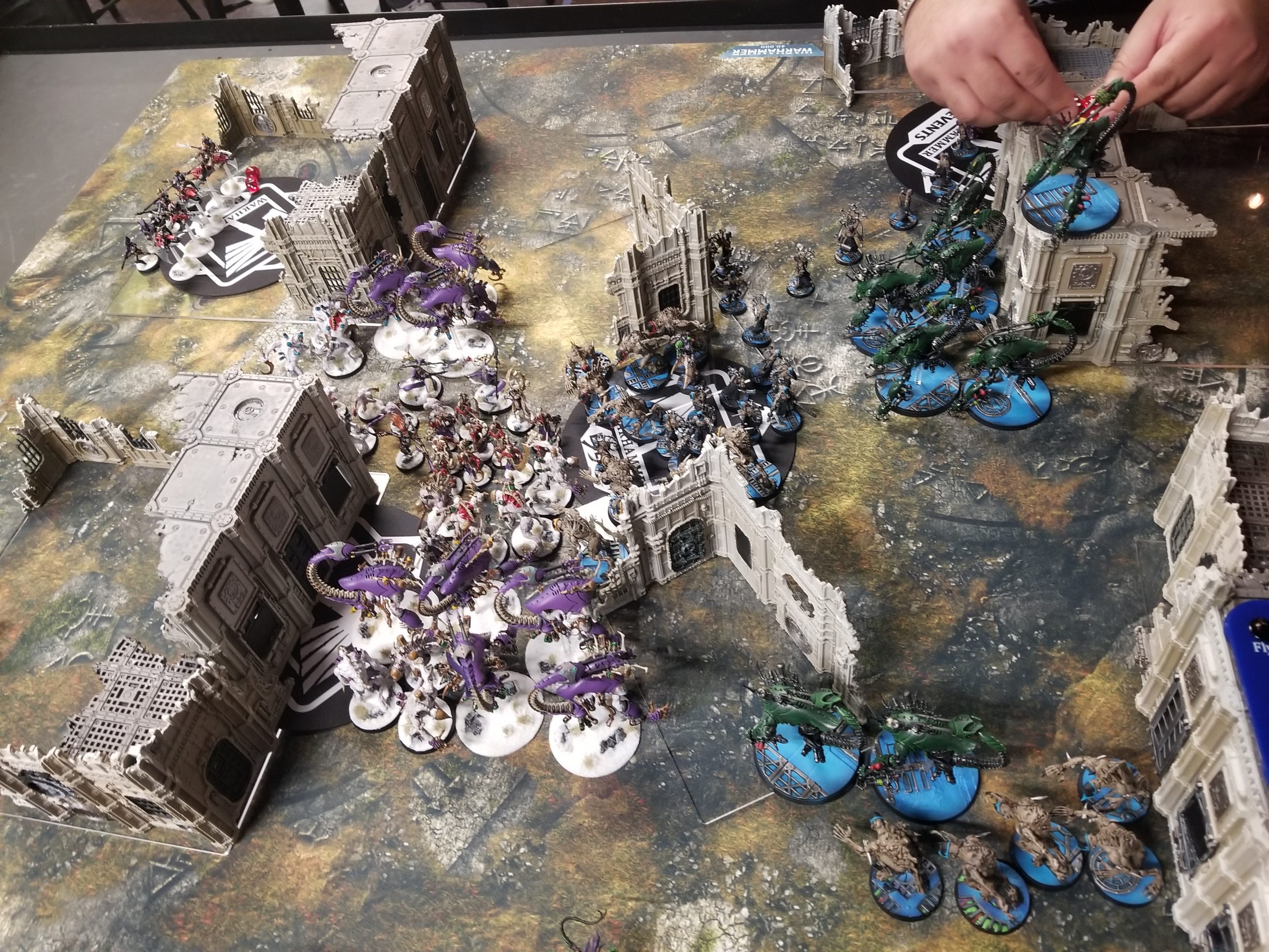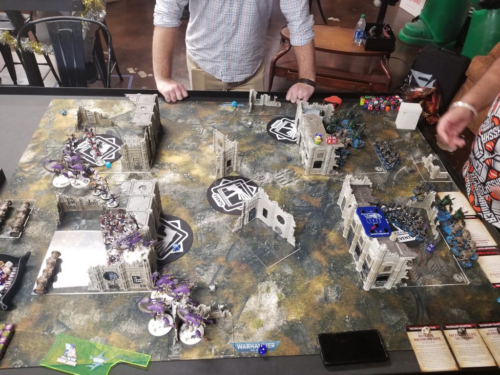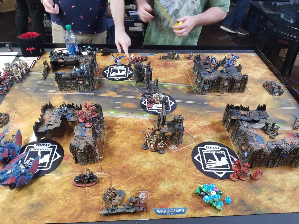 I'm gonna level with you: I have no idea how this will go. I'm not even sure many of these models will actually die - Mani needs to push forward to prevent Herd scoring and he needs the free movement for that, so the charges are mostly to do that, and if he fails a couple of 5" or 6" charges it might be bad. But there's also a ton of feel no pain saves in there and either player could get lucky and just turn the tide early. I do know that whoever wins, we lose.On Brad and Jack's table I don't think things look good for Brad. I confirmed with him my strategic thoughts and got a nice little boost to find out I was right, but then realized that Jack can just spread his whole army across those two objectives trivially and can be just as fast as Brad's Eldar. Good luck, Brad. You're gonna need it.