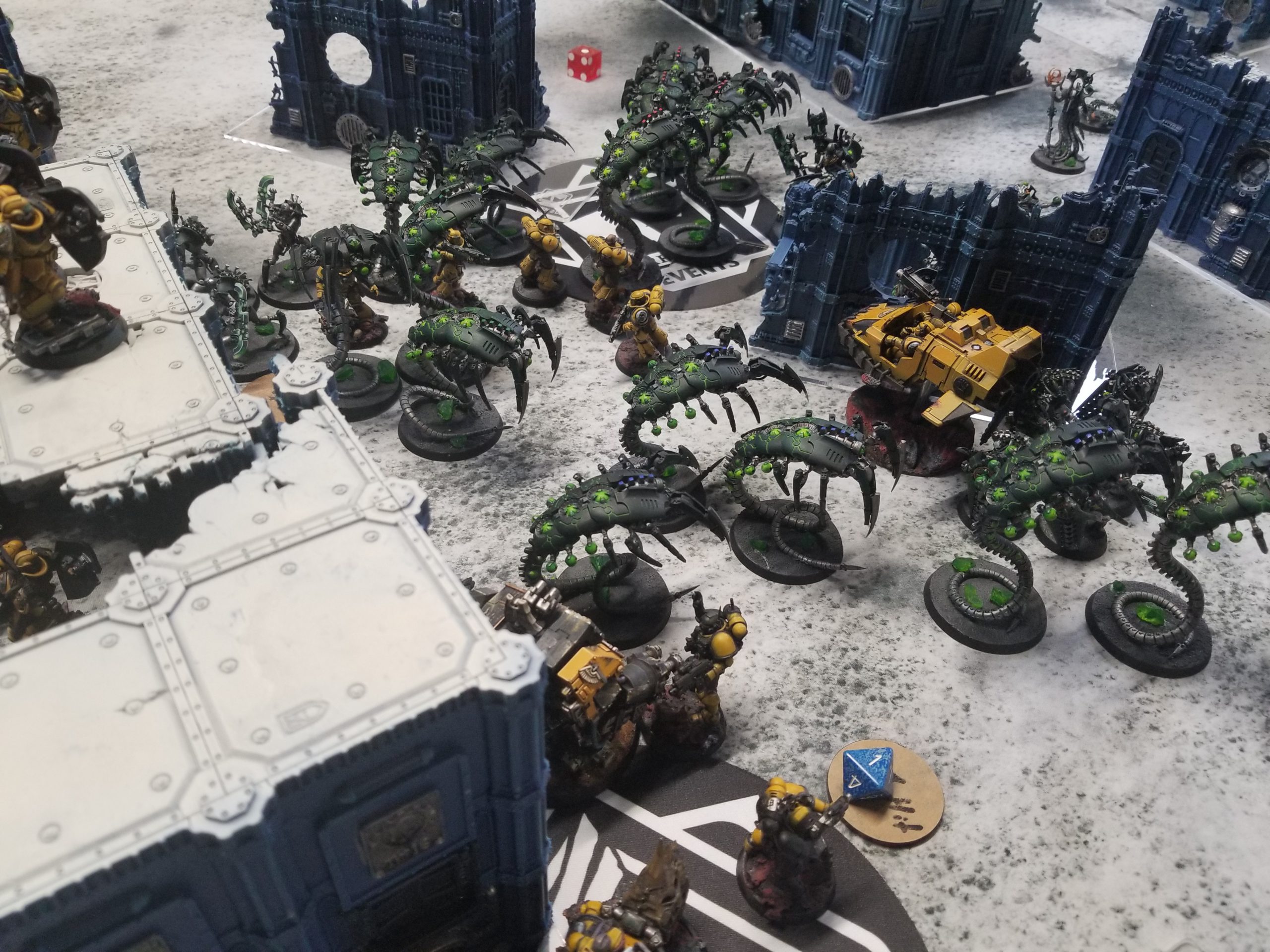 Credit: Mani Cheema and Sascha EdelkrautWe're also running super late in the round and two of the 40k exhibition and one of the AoS exhibition games are still going. It looks like on the 40k side the generals won all four of their games - Mani's Necrons cleaned up against Sascha's lovely Imperial Fists, while Old Man Chester's Craftworlds beat Blake Law's Imperium forces. Harpster looks to be cleaning up against Cannon Biggs' Gensetealer Cults. And despite a valiant effort from Dan Boyd, it looks like Kelling is gonna take that matchup on points.
