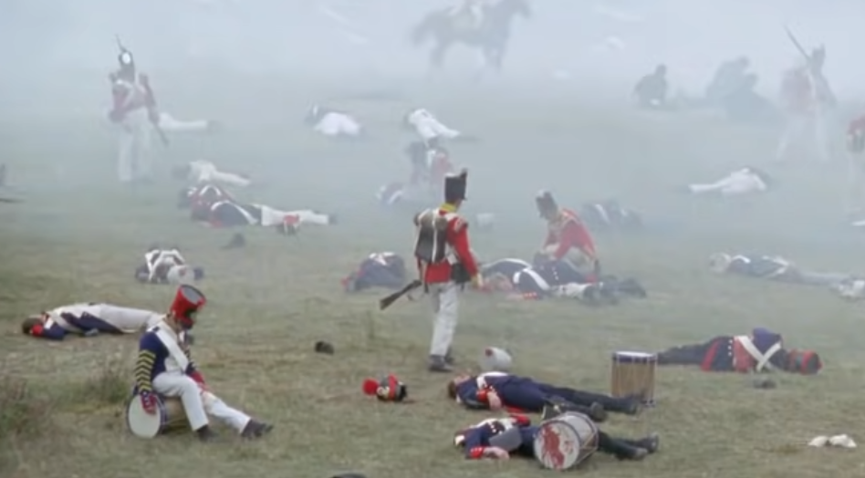 This means that even though the story’s the same, the characters are the same, the dialogue is the same, the shift in medium changes the message. Because the books could play in the theater in your mind. Vivid descriptions of cannons roaring and legs being ripped off and blood and guts and gore and war is hell, ra, ra.