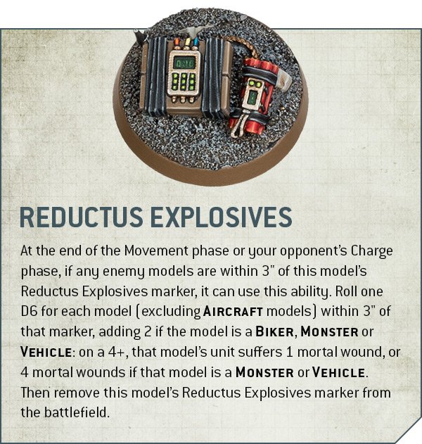 Source: Warhammer CommunityIt would, of course, be a little dull if you couldn't add more hidden explosives during the battle, and that's what the Reductus Explosives rule lets you do - once per game, you can use an Action to set up an explosive marker, then as long as the Saboteur is alive you can detonate it as above. The cool thing here is that the timing on the Action has been designed so that you're actually incentivised to use it - it runs from your Command Phase to the end of your Movement Phase, so you have to stay still to do it but you don't have to give up using your juicy shooting attack. That incentivises you to try and hustle her into a key position turn one, then on turn two she can set up a trap while also starting blasting. Just what you want.