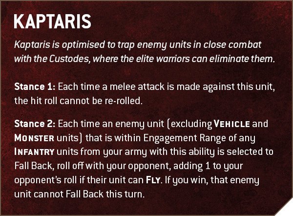 That's a very potent combo with the Kaptaris stance from Martial Ka'tah, which puts a severe cap (get it? like Kaptaris?) on any opponent's damage output. Getting into combat and staying there helps you more broadly too - while mostly a killer, the Martial Inspiration ability means that any fellow Custodes trying to charge into something the Champion has already engaged get +1" to their rolls, especially helpful for your Deep Strikers.