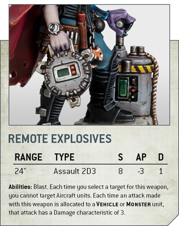 Source: Warhammer CommunityYou're going to get the most value out of her in the Shooting Phase, because the Remote Explosives are legit. I really like the design here, as modelling "I am a master saboteur who has seeded the battlefield with bombs" as a shooting attack is a nice combination of flavour and ease of play, and given that she's shooting at BS2+ they're a genuine threat to enemy vehicles and monsters, while still far from terrible at picking up a few infantry models. Given that there's no limit on how many times you can use them, and you can protect her both with Look Out Sir and with her Clandestine ability, you should be able to keep hammering away with these for most of the game, which is a lot of value. Up close, she also has a one-use demo charge, which can be handy in a pinch against 2W infantry (and if there's any stratagem support for Grenade weaponry in the new book, she's going to be at the front of the queue). While she probably won't be using them much, it's also worth calling out that she shows off a change to blasting charges, which are now S5 AP-1, but only d3 shots. That honestly looks like a huge upgrade (it's the same for Neophytes), as it's relevant against a far broader range of targets, and only fractionally worse against 11+ model hordes compared to the old frag grenade equivalent profile.