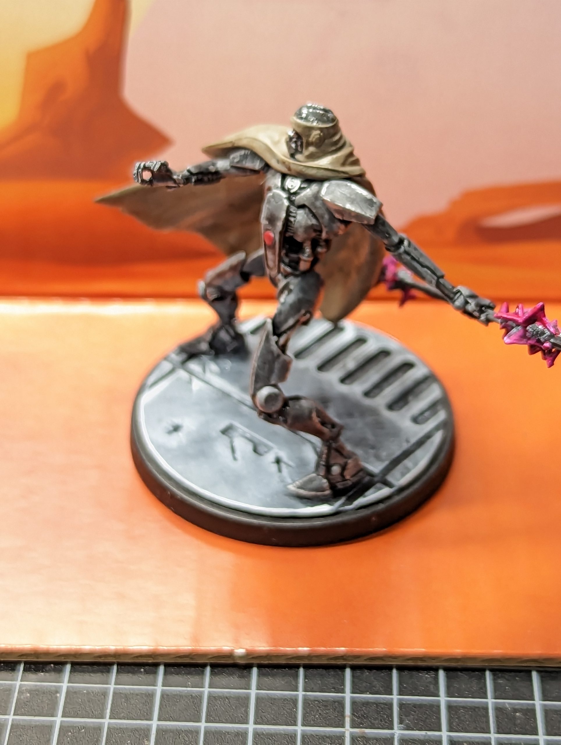 Close up on Magna Guard - Credit ThundercloudOnce this had been done I gave the model a coat of gloss varnish and then pinwashed a number of the seams on the model to give even more definition to the various plates and edges. I did the cloak in a few thin coats of Rakarth Flesh with a wash of Agrax Earthshade, with an extra bit of wash along the bottom of the cloak to show a build up of dirt from being dragged on the floor.
