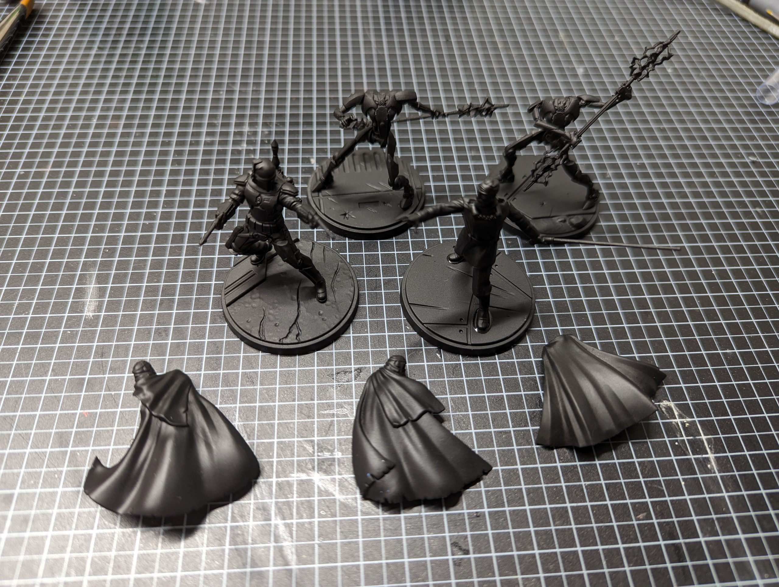 I built the models and glued them to the bases. I used Tamiya ultra thin polystyrene cement, and left the cloaks as separate pieces because of how much of the body of the model wearing them would be hard to paint with them on, and vice versa. If I were to do it again I would paint Dookus head as a sub assembly as well. I also found Tamiya extra thin led to some fragile joins between feet and bases, and had to go back and reglue them later as the small amount of pressure caused by painting caused them to pop off the base. You can see Dooku got gorilla glued in the picture below.