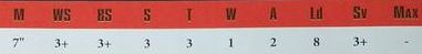 The basic statline for Sisters gives you a model with a 7” move, 3+ BS/WS, Strength and Toughness 3, 2 Attacks, 1 Wound, Leadership 8 and the 3+ save you get from power armour. This gives you a faster but less resilient Space Marine essentially. Slightly cheaper than marines, you can reliably fit 8 models in a 100 point force.