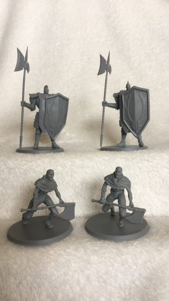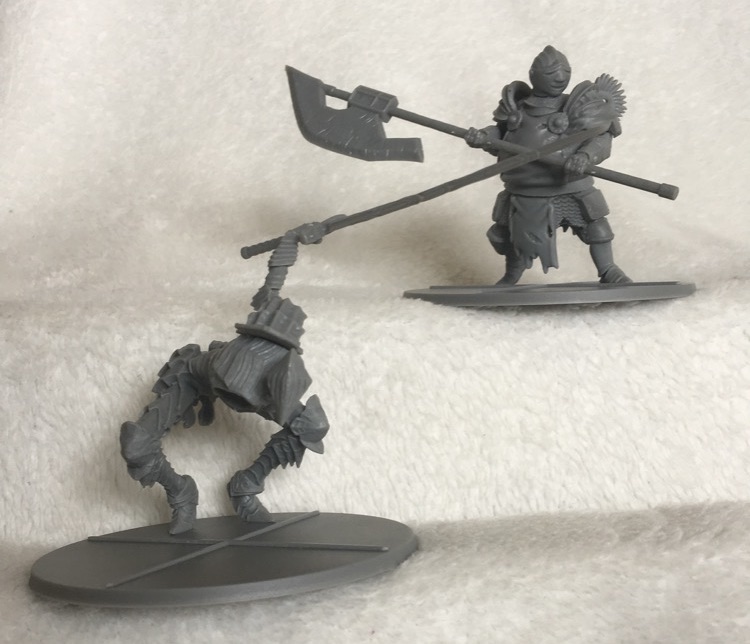 Side-by-side of a Hollow Soldier and an Alonne Sword Knight.Both the Alonne Knights and the Hollow Soldiers are labeled as Medium on their stat cards, but the Soldiers are notably larger than the Knights. This doesn’t matter much for the character itself, but the base needs to be sized correctly for gameplay since this affects movement, anything with an area of effect or even simply understanding where characters are in relation to each other.