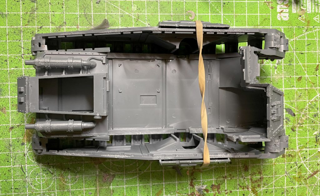 I should have used more bandsThe components fit so snugly - particularly around the top plate - that adding new pieces tends to push old ones out of alignment, and the slightest warp out of true from some of the smaller plastic pieces will create yawning gaps. Most of these I managed to sort out with dryfitting, filing, sprue goo etc, but others opened up once the final steps of the hull were completed. While the build isn't difficult - you can throw this together in half an hour if you want - it is difficult to get exactly right. Even with all the care I put into the build here, I wish I’d taken even more time on the top plate and front, and it’s worth letting each stage dry completely before starting the next - otherwise the top plate will slightly lift off, and that leaves an ugly gap you’ll need to fill.