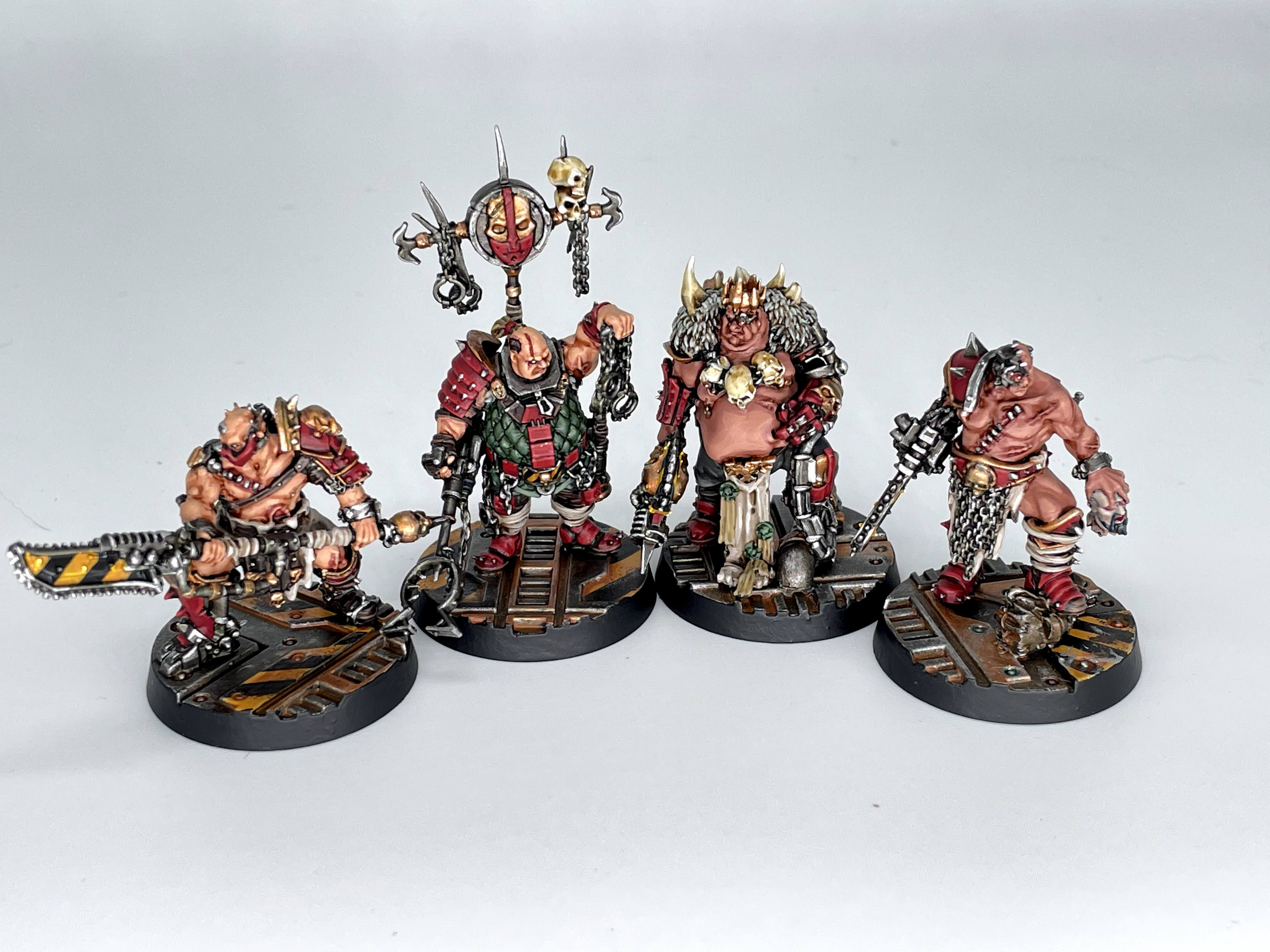 Not wanting to stop my rust-and-resin streak, I painted the Mercator Sanguis Slaver Entourage for Necromunda next. When I first unboxed these bois, I took one look at the resin flashing between literally every tooth on their chainweapons and promptly returned them to the box they were living in. Almost a year to the day I had done this, I finally built and painted them. They are spindly, fragile, and have never seen the tabletop. I love them.