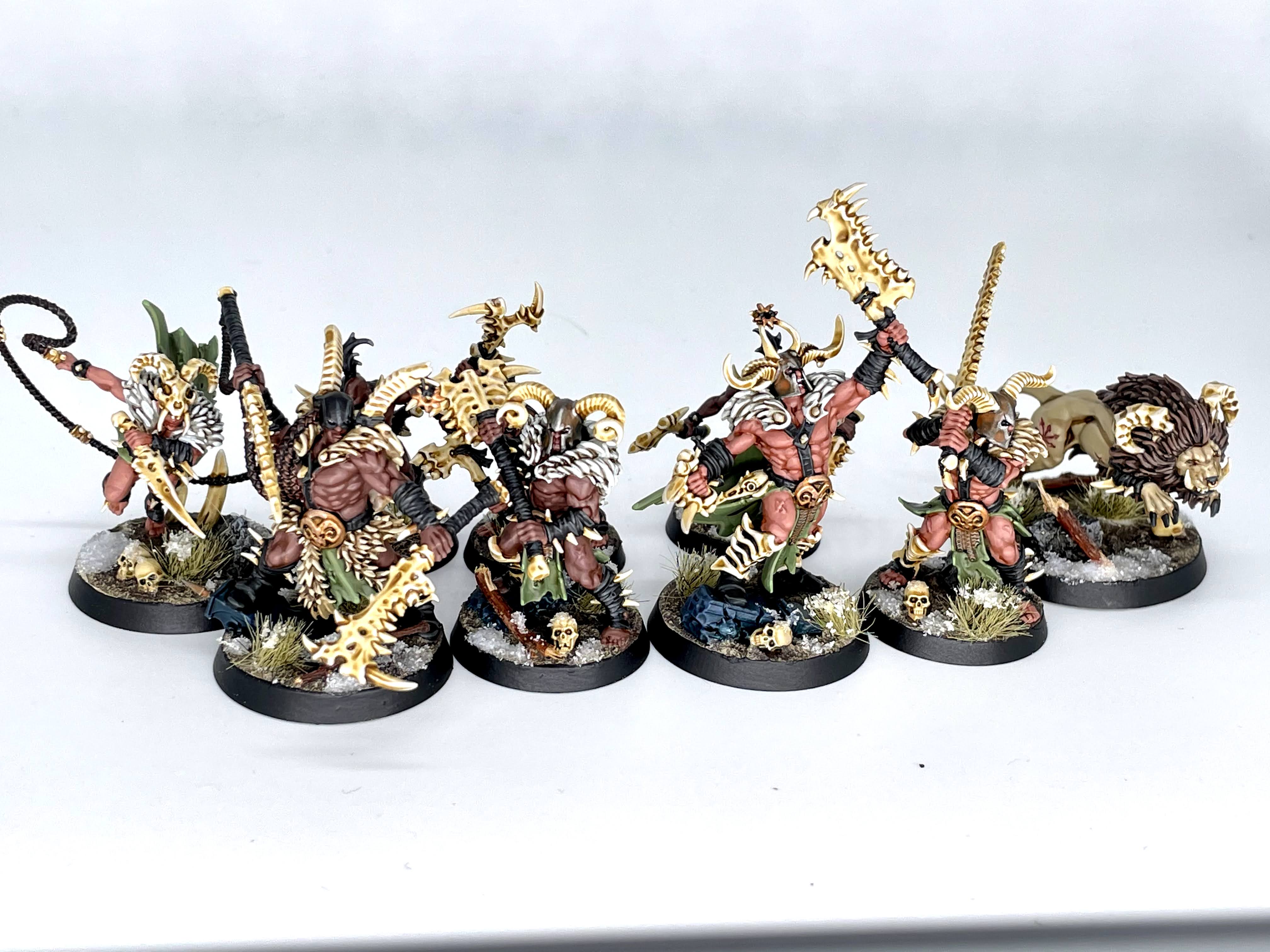 As I was working through my collected backlog of weirdos, I finally painted a unit usable in a mainline Games Workshop game, Age of Sigmar. These Untamed Beasts were my first real experiment with Contrast, specifically on their whips and bone clubs. I made the mistake of Contrasting them first, which meant I rubbed off most of the paint with my greasy mits during the painting process. I had to repaint their bone weapons and varnish the models afterwards. Lesson learned for the second batch, which is still primed in my closet. I wouldn't play a game with these models for 8 months.