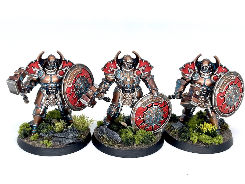 The Stormcast Annihilators, who will now be known as Thicc, Bricc, and Ricc, were unexpectedly the most enjoyable unit to paint in the entire set. Vast expanses of metal, broken only by other, more different expanses of metal and a few pops of color make them supremely quick to paint up. I left their shields off until the last minute, as on occasion I have been known to plan something correctly and intelligently. You may notice that they break up the unit-hero-unit-hero rhythm I had deftly defined, and that is because of this particular jerk:
