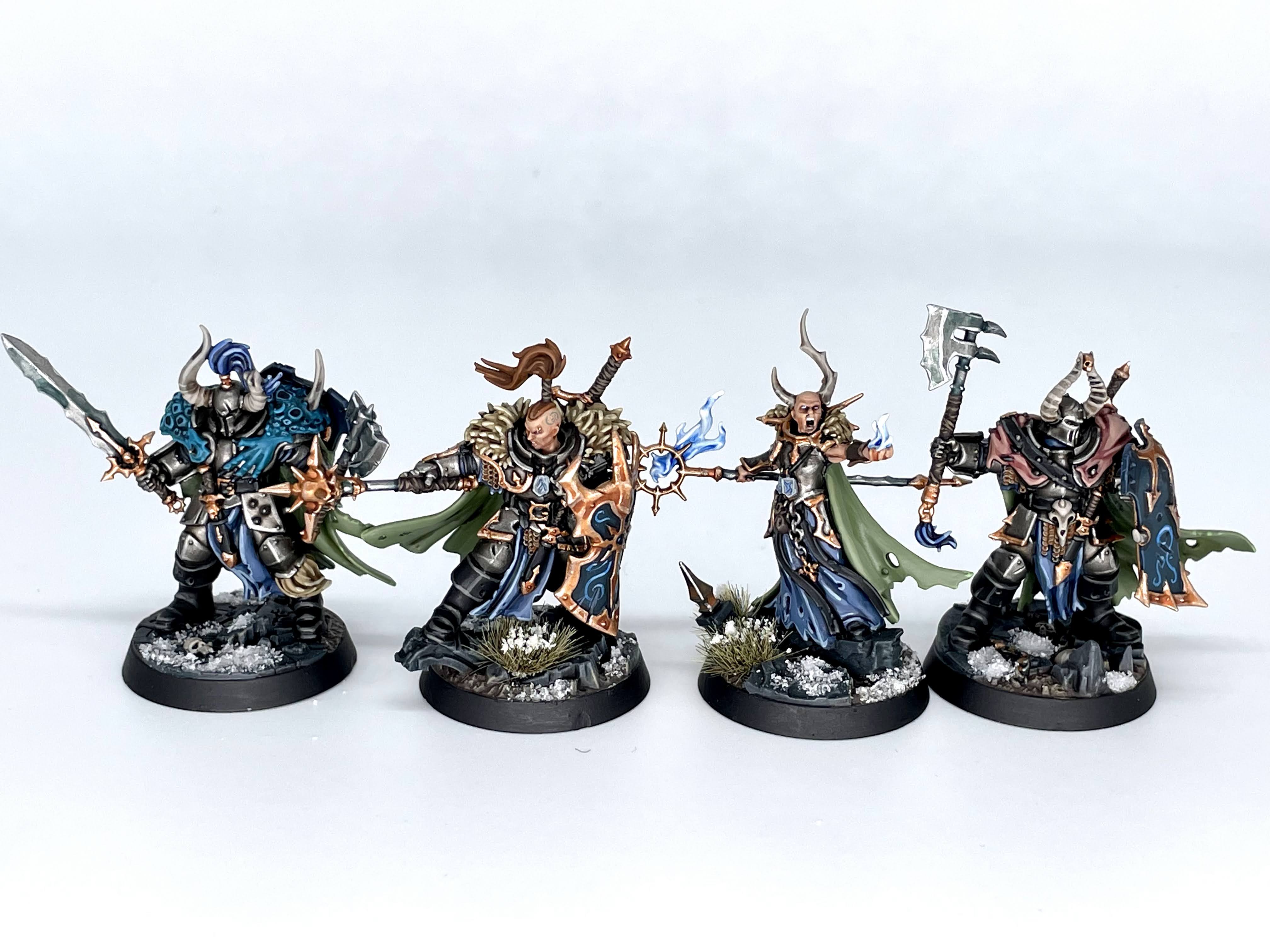 I threw off the pattern almost immediately by buying the Easy to Build Sequitors because my wife had the same cool haircut as the unit champion. I purchased a pair of regular Sequitors on eBay to bulk the unit out to a game-legal 5 models. I did not mean to paint a self portrait with the bald bearded one on the middle right, but sometimes we make happy accidents. Headswaps were important here, as almost to a fault, Stormcast bare heads are cooler than their helmeted alternatives.