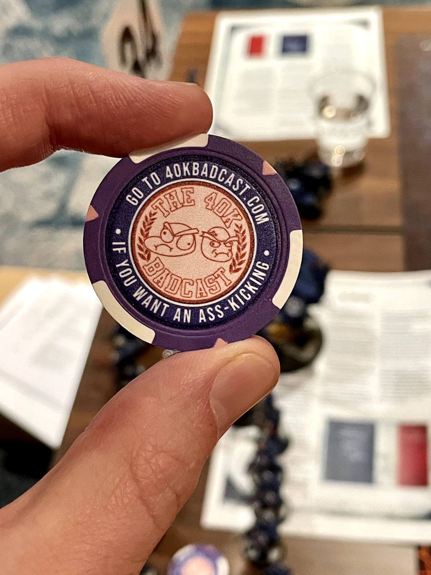 It was the distinct honor of my 40k Badcast cohost Dan and I to sponsor the event, and we made a truly comical number of poker chips to use as objective markers. We have since started sending them out to folks who donate to the Texas Equal Access Fund, so if you want to help women have control over their bodies and also make my cohost's life slightly harder, donate $50 and send us the receipt at contact@40kbadcast.com. Own Dan with kindness, people.