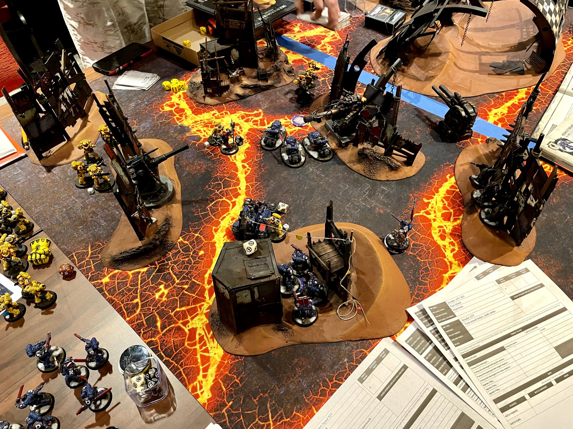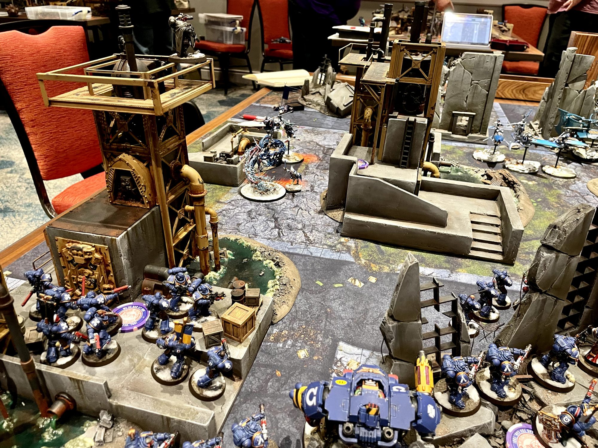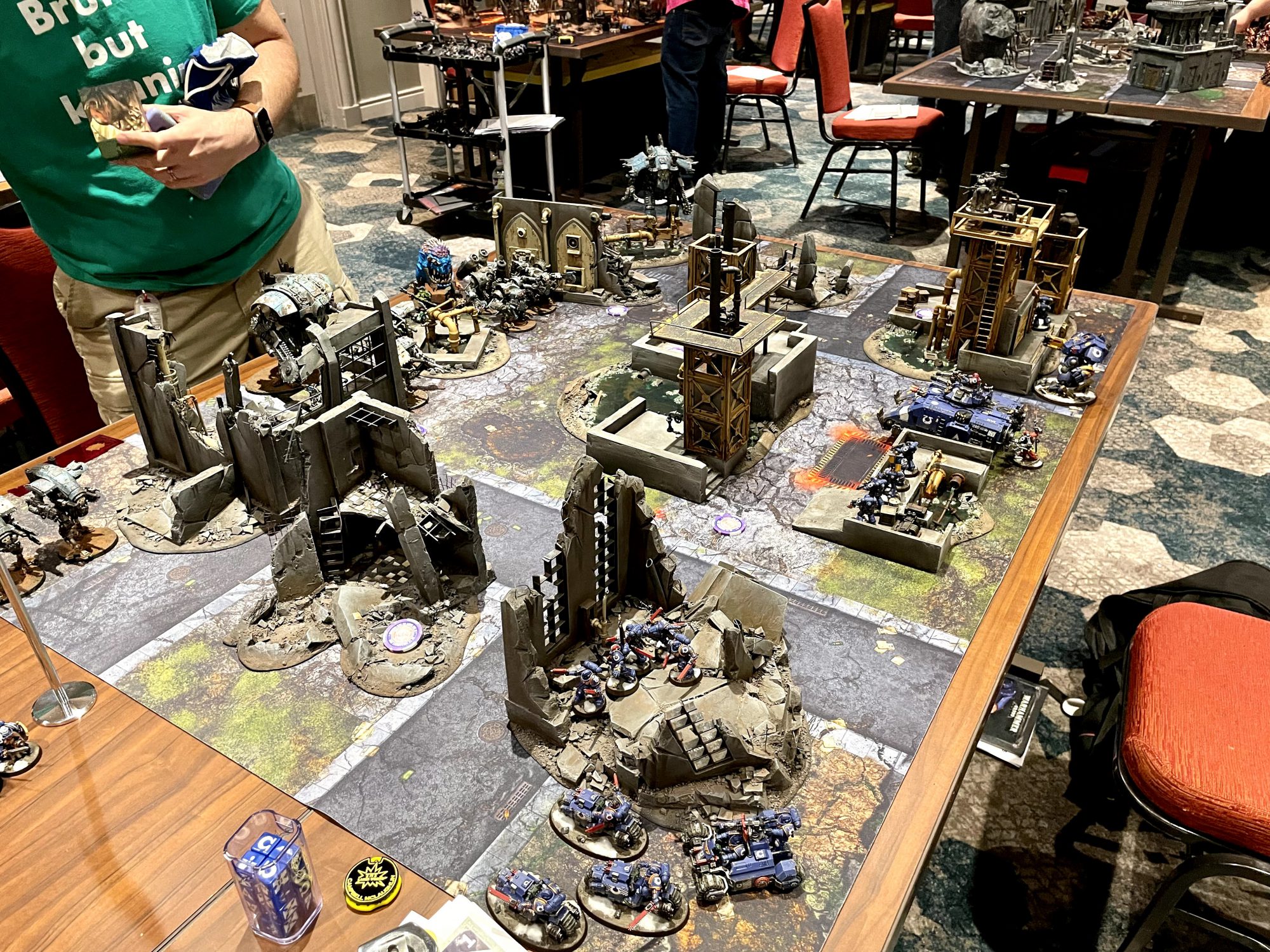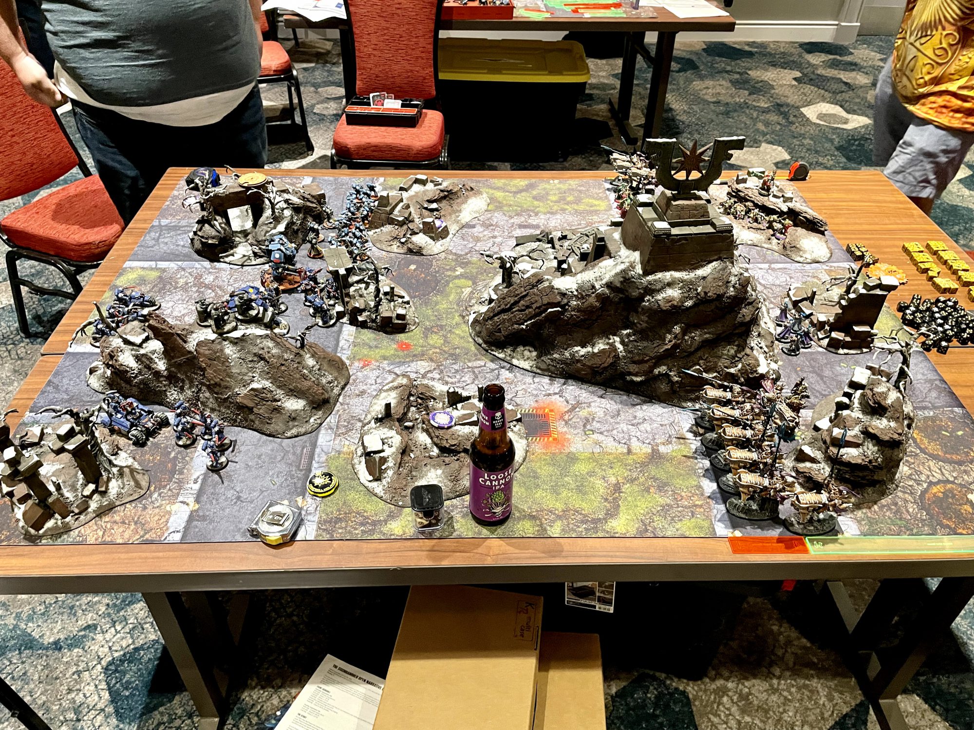 This summer saw Miniatures Mondays start at Modern Games, which not only gave some weekly structure to the pandemic malaise of every day being a uniform grey paste, but also saw a return to in person games against strangers outside of my house. Some of these strangers became friends. Some of these strangers became familiar faces who I'm happy to see each week. Some of these strangers remain strangers to this day, but time may change that. This expanded my play experience hugely, letting me try new things, play against new armies, and skip the laborious process of setting up my own board every game. It also gave me time to brush up on 9th edition for this summer's marquee event, which your eyes will likely already have drifted to due to the bold typeface below: