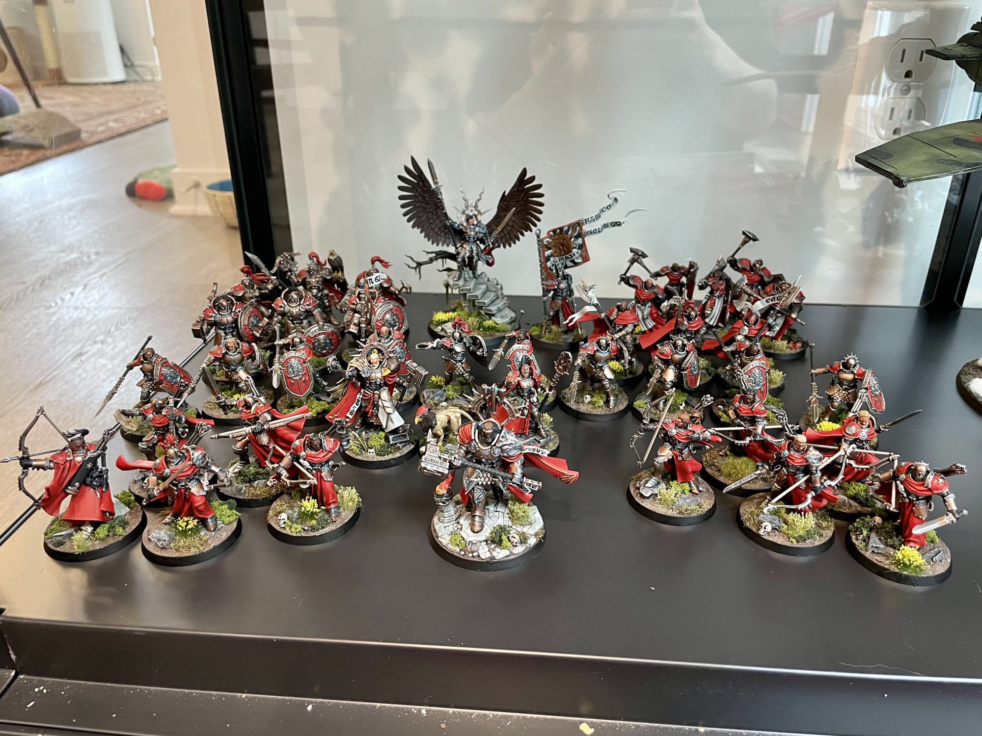 Had I known the supremely vexing Knight-Vexillor would be such a challenge, I would have saved him for last. You see, I painted the entire dude before switching to Thicc, Bricc, and Ricc. It was not hard, and was rather pleasant. However, that banner is the stuff of nightmares. Even had I painted it one solid color instead of the patterned black and white stripe/Non Metallic Metal gold combo, merely getting a brush behind his spiky dome and into the folds of the flag is an ordeal. Stabbing my brush violently behind his bespiked helmet very likely cost me the point on my pricey Scharff Series 3000 Supreme Red Sable Fine Line Size 0 paintbrush. The worst part is that I am not even particularly thrilled with the end result, but you won't see me returning to this banner-waving weirdo.
