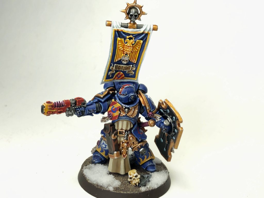 Lieutenant Caestus Ignus, Bane of the Fivefold, armed with Traitor's End and Purity, covering himself safely behind his shield, Grim Defiance. His Purity Seal bears the prayer "Rub a dub dub, thanks for the grub" and his Record of Battle says he defeated Trakhsis, The Gleeful Eradicator, on the world of Derek's Mom's Dining Table IV