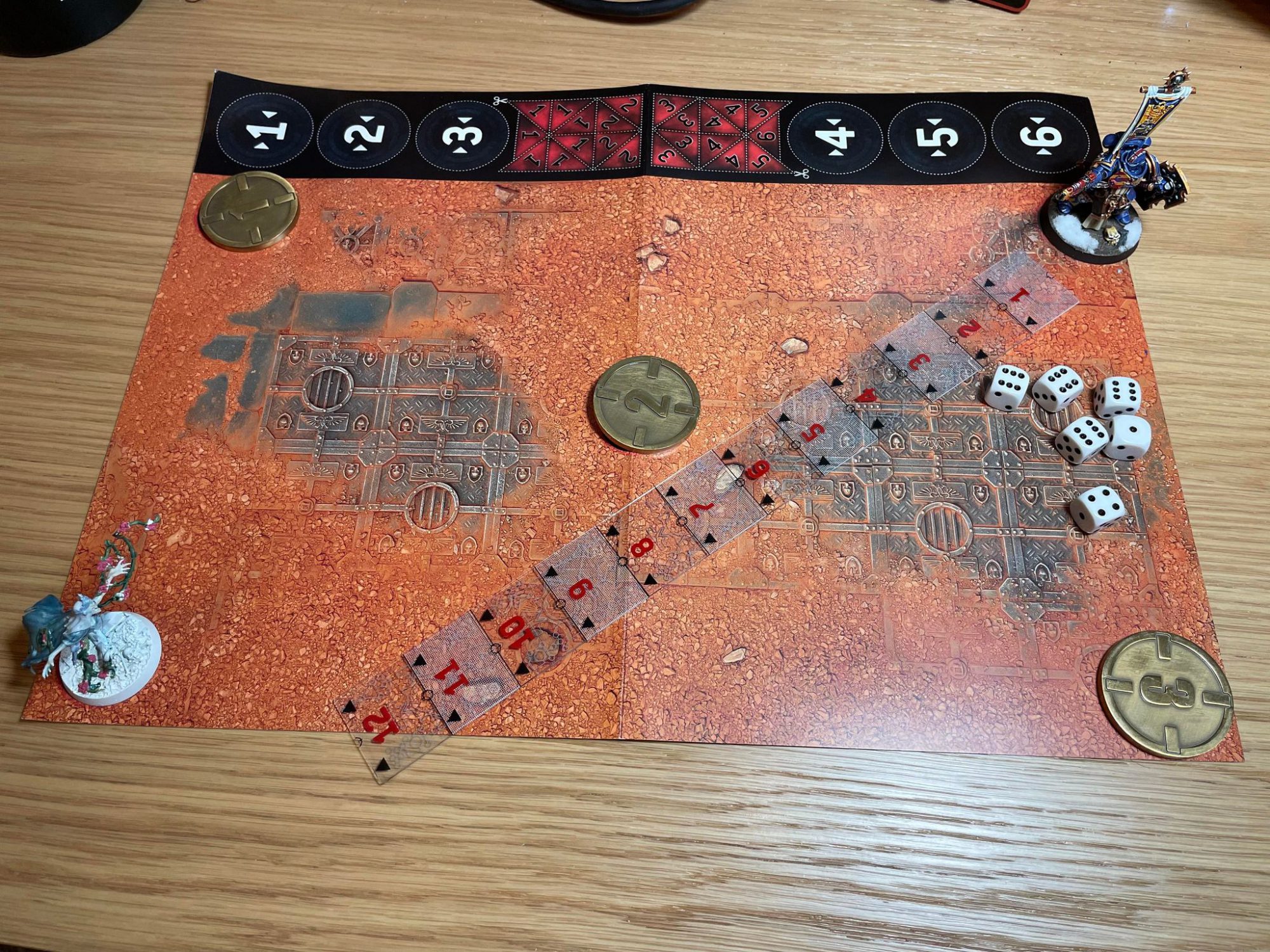 A double-sided 11"x15" card playmat is included, with a little Martian desert with 5 marked alphabetical spots on one side and a Necron laser tag arena on the other. The sidebar has wound counters and objective markers to be cut out. It's nice to have a little arts and crafts project, as a treat.