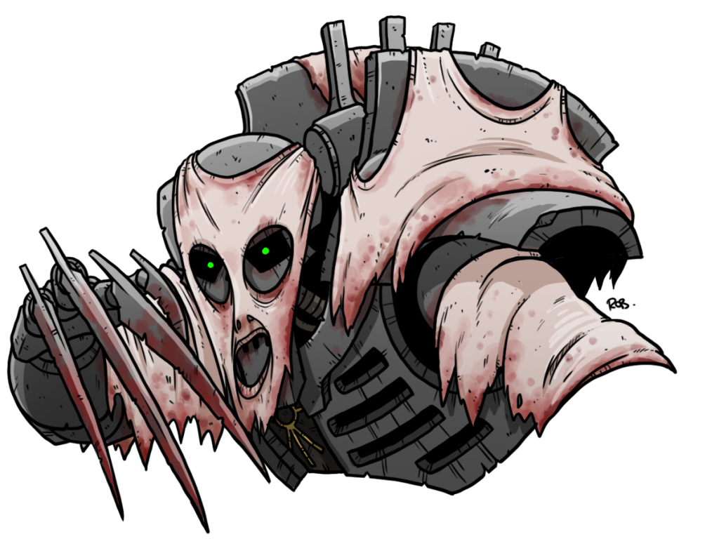 One does not earn the designation "Steel Raveners" for nothing. Where this title came from is a mystery, as the Guard stationed on Derek's Mom's Dining Table IV could not utter more than a scream at their sight. This pack of Flayed Ones prowl around on all four limbs, like the feral beasts that once stalked Old Earth. Their serrated bone-cutting blades were perfectly suited to rip out the spines of their prey, which they wore on their bodies with something resembling pride.