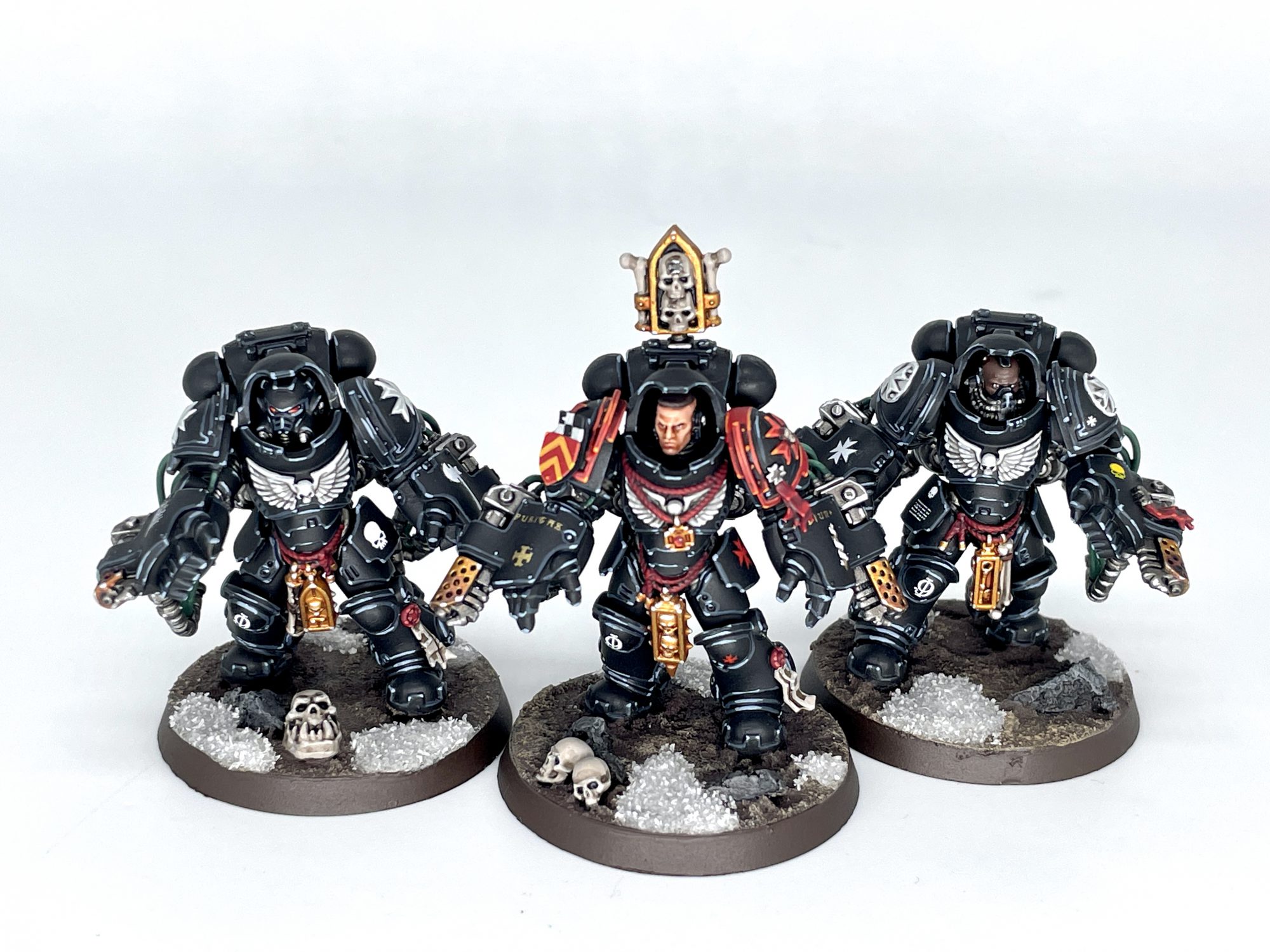 Black Templars Aggressors. Credit: SRMI hope you like paints, dear reader, because this is another issue with two pots of That Good Wet Stuff. The pair of colors are staples of my own painting, and I'm happy that developing hobbyists will get a handle on two of the most versatile colors in the entire Citadel range. First is Rakarth Flesh, a highly pigmented tan/bone/beige Base Paint that's great for purity seals, bones, or flesh on your Rakarths, I guess. It's never read as a skintone to me, but for the pale skin of the Dark Eldar, I guess it'd work with some washes. My bottle of it came fairly chunky but nothing a good shake shouldn't fix. Second is Nuln Oil, one of those "talent in a bottle" sort of Shades that everyone should already have a few pots of in their toolbox. The size of the bottle implies that it is not the new formulation, as I can't imagine they'd put the new stuff in anything but the now-standard 18ml pot.