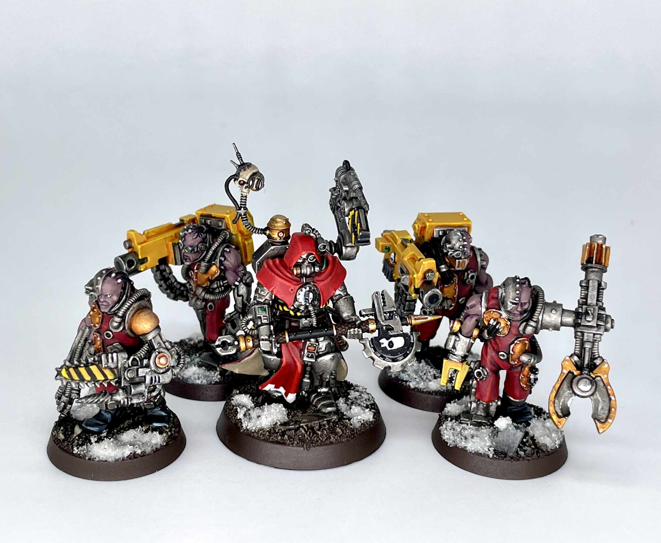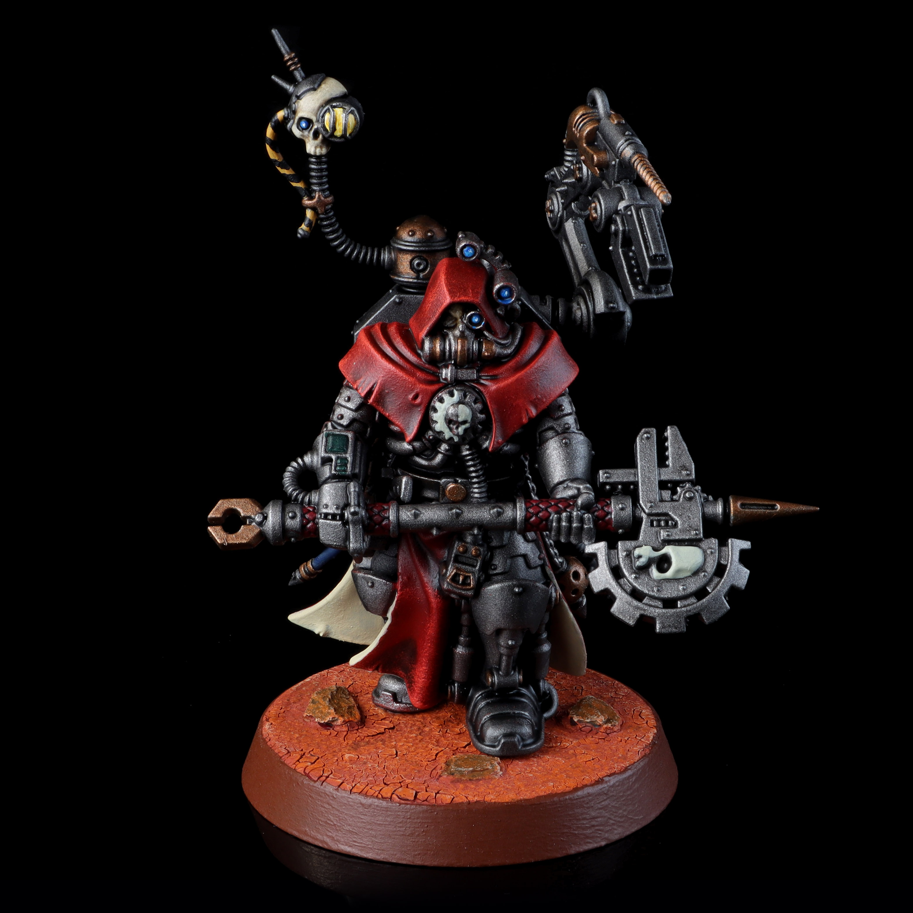 After defining just who our new plastic friend is, we get to learn about a few more forge worlds. First is Stygies VIII, "The Ever Staring Cyclops" in the parlance of this magazine. As far as subtitles go, "The Ever Staring Cyclops" goes harder than most. These black and red-clad dudes are all about xenos technology, and have a borderline heretical interest in utilizing and studying it. In a very Warhammer bit of irony, their forbidden studies are the only reason the Imperium understands Blackstone as well as it does, and yet they are shunned and investigated by the Inquisition for actually trying to learn and better understand the universe. You know, that thing the Mechanicus is nominally supposed to be doing.Valfurion Siraxus, Master of Automatons, always liked to surround himself with his own creations. Servitor Designation Kas-66.75/mk98, of the Pringalia mk98s, was an especially nuanced creation. Valfurion even let his favored servitor act as his personal arming servitor, a task as honorable as it was radioactive. With battle on the horizon, Valfurion keyed his wrist-cogitator and began the equipping sequence. First, his servo-arm, Cognitic Divinator, whirred to life, its jaws testing their crushing capacity and its drills finalizing their ideal level of torque and RPM. Next, Servitor Designation Kas-66.75/mk98 presented their master/creator with his relic Omnissian Axe, Mk. 3 Blade. It had broken enough times that Valfurion would no longer deign to give it a proper title, and its machine spirit was as fragile and temperamental as its Martian steel. Finally, with a rapid clicking of his Geiger counter, he unholstered and thumbed on his Mechanicus Pistol, Mk. 4.XII Annihilator. This too had broken many, many times, but it had kept its proper title. When Valfurion was still a child mostly of flesh, he thought the name "Annihilator" sounded, in his youthful words, "cool as hell". Now, as a borderline ancient adult, he still knew it to be true.