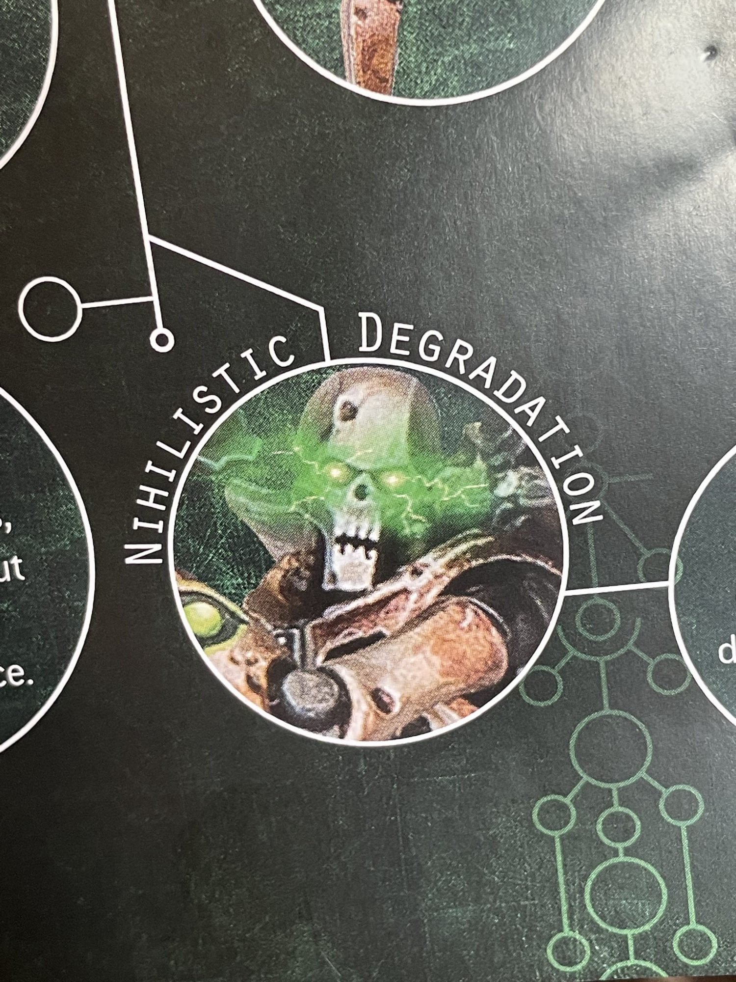 These ever-entertaining tables are followed up with some lore about Skorpekh Destroyers, the creation of a Space Marine, and a section on The Warp with the travel brochure-esque subheader "Destinations and Daemons". I knew nothing about Skorpekh Destroyers before, so was entertained to learn that their Plasmacyte companions take the bad code out of other Necrons and inject it into their Skorpekh friends, sometimes making them so crazy they just die then and there.