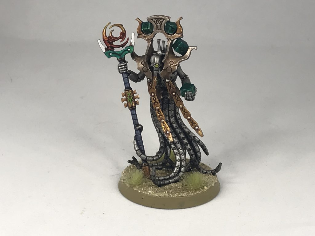 Chronomancer. Credit: RockfishThe sole model this week is the Chronomancer, a rare character model with options and variety across his two sprues. They're one of those models that evolve the Necron aesthetic, starting at "space pharaoh" and ending somewhere far, far stranger. This model is likely the most complex to show up in Imperium thus far, featuring many, many fiddly bits and small joins. Nastiest amongst these are the separate sides on his floating Gamecube, which make a good case for having a pair of hobby tweezers. All of his options are presented in these thorough instructions, and they aren't as restrictive as previous issues have been. Often the instructions would only tell the hobbyist a single way to build their models since they were to be used in a heavily simplified version of 40k, but since we're playing with the same Datasheets as you would find in a codex, more options are made available.