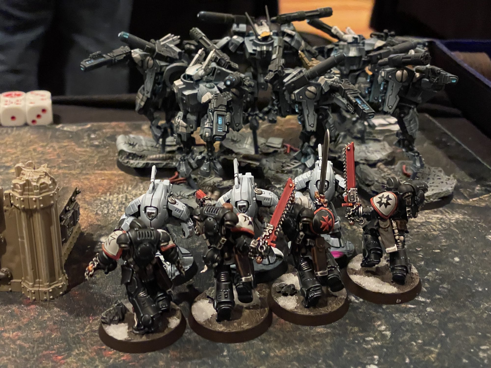 Black Templars vs. Tau. Credit: SRM and AndyLastly, we have one of those uncommon Imperium centerfolds concerning the xenos threats of the galaxy. Orks, Tyranids, T'au, and multiple flavors of Eldar are shown with some typically lavish photography and a brief writeup of each's whole steez. We've already learned about these various forces in previous issues, so the information seems somewhat redundant for the most part, but the T'au do get a stronger focus. The reach of their empire is illustrated in a T'au-style user interface, and there's a brief history of the species from an Imperial perspective. Our recurring lady Inquisitor Gallius Shaarn pops up to say "Suffer not the alien to live" and that's pretty much it. As someone who can't seem to win a single game against T'au or Eldar of any variety: Go off, queen.