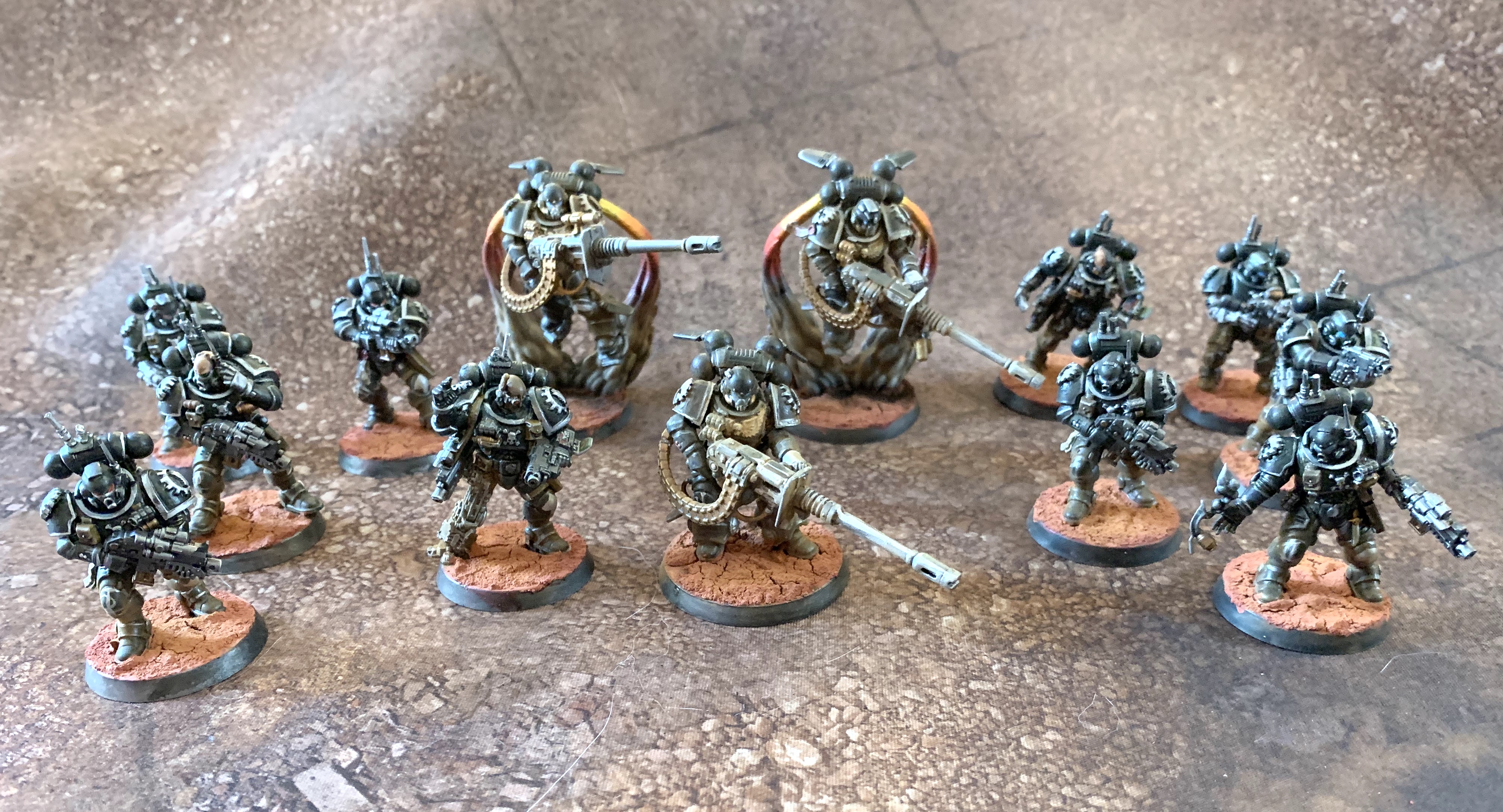 We move on from our collection of sneaky Marines towards something altogether more alien - the Second Tyrannic War. Hive Fleet Kraken had come from the Eastern Fringe, passing through the on-the-nosedly-named world of Obliterax before coming to Ichar IV. The wide ranging nature of these hive tendrils and the Shadow in the Warp they cast slowed the Imperial response, and the Lamenters and Scythes of the Emperor chapters of Space Marines were nearly destroyed as a result. Fortunately, on Ichar IV the Tyranid menace would be stopped once some main characters showed up. Marneus Calgar and the Ultramarines led the defense of the world, driving back the hive fleet at the cost of nearly the entire planet. Kraken also brought doom to Iyanden, permanently scarring the craftworld, and only being driven off by their own main character in Prince Yriel.The Eliminators of Squad Romanus, the so-called Bearers of the Torch, had been hiding along the ridge for nearly 3 days. Prone, Brother-Sergeant Romanus scanned the valley below with his magnoculars, only for a Necron Command Barge to hover into view. "Primary threat spotted." he sub-voxed to his squadmates, Brothers Gnaeus and Gnaeus. These Macragge-born snipers had been grouped together alphabetically, and with a name as common as "Joe" on old Terra, the two unrelated Gnaeuses were pressed into service together. Experts at sniping from cover all, they sighted the Xenos Overlord on his barge, waiting for the target to come into optimal range. "3 Mortis rounds, fired in unison, should put an end to any alien." Thought Romanus. Just then, there came a sound like the Emperor's own drummer playing in 4/4. Suppressor Squad Belaphon, The Dawnbreakers, leapt above Romanus' careful sniper ambush, their Accelerator Autocannons hammering the Necron vehicle. These outflanking specialists perforated the command barge with their ceaseless volley of shells, with Brother Marius scoring the kill-shot on the Overlord himself. The barge exploded and Brother Viridius let out a triumphant whoop before jumping over the next ridge, his Suppressor squadmates on the hunt for something else to kill. Romanus rolled onto his back, dejected. "Maybe it's time for a nap" he said aloud.
