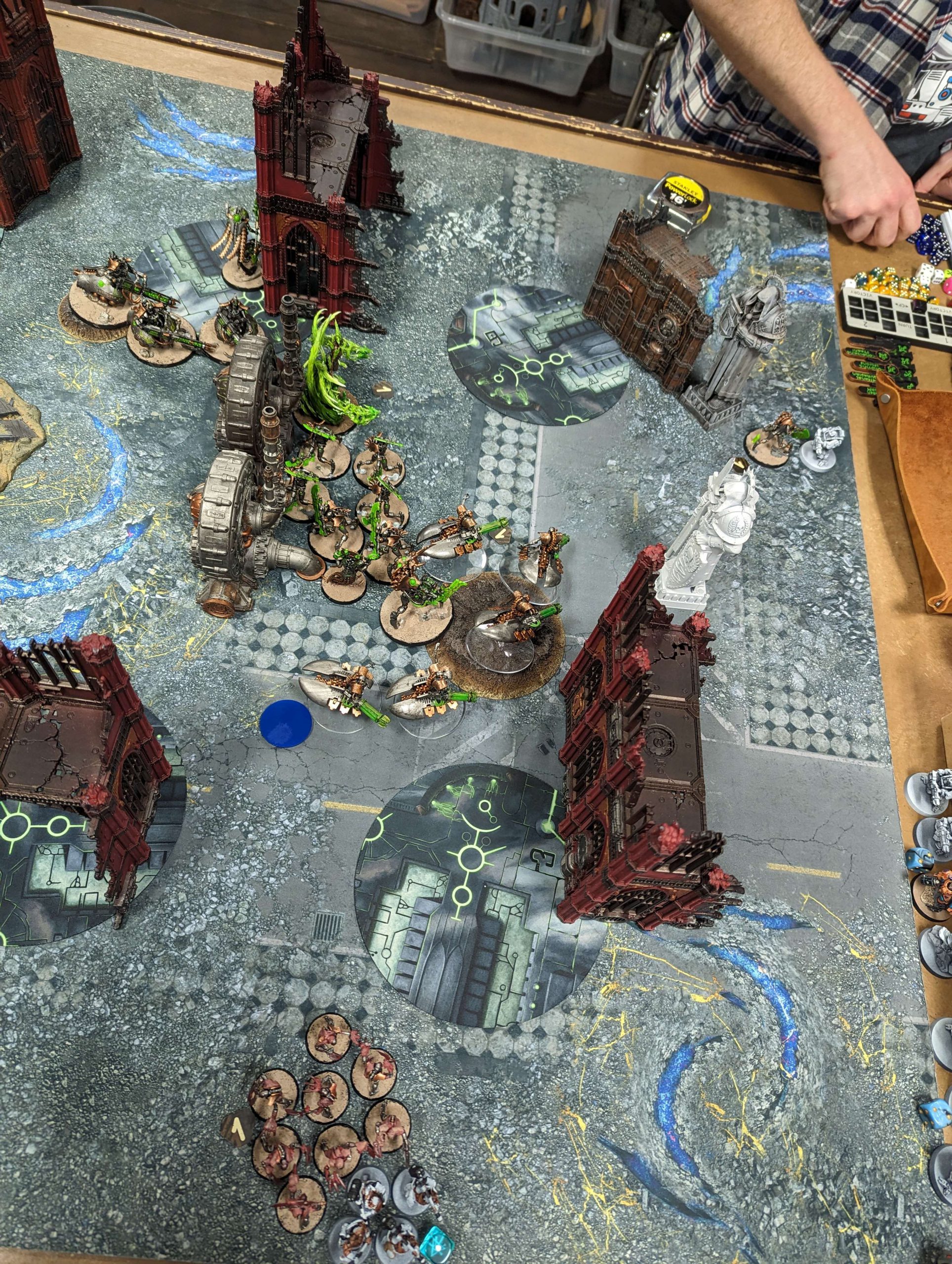 A very dire situation for the dwarves (they're all dead), Credit: Rocco GestThis week's mission, The Battle Above, takes us to the stars above Kjalma's Skull, where Necron boarders have teleported aboard the Imperial vessels. It's up to the human defenders to keep the Necron invaders from sabotaging the ammo stores and engines of their ship, and this is represented in a wonderfully asymmetrical mission. The Necrons deploy in a tight corner representing maybe 1/8th of the board. The Imperials deploy in a long L opposite, stretched thin across a broad expanse. 5 objectives scatter from the center towards the Necron player, and if they can sabotage 3 by the end of turn 5, they win the game. There are no other objectives - it's just sabotage or die. I love this. While the terrain supplied thus far might need to be finagled to get a real boarding action vibe, it's a thematic and fun mission that sounds like an absolute blast to play.