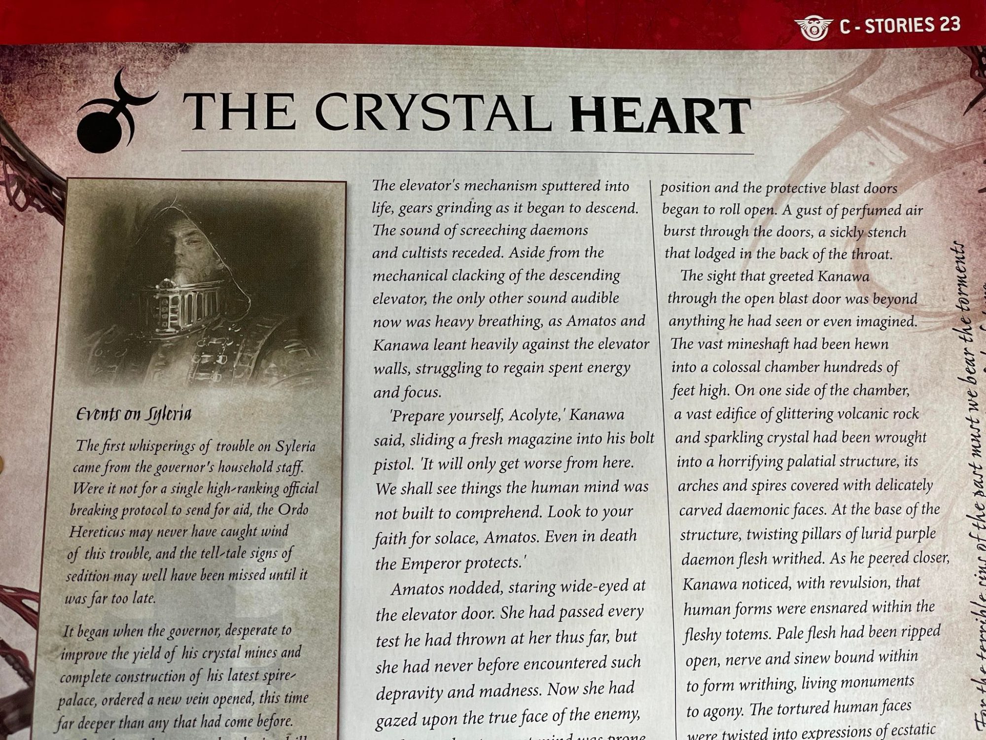 Imperium Story Example. Credit: Hachette PartworksAside from just enjoying both bold and extrabold title faces preceding all-italic text blocks, I thought it would be prime time to plainly show what the average Imperium article looks like. As for this story, I at first was confused - the previous chapter felt like a perfectly satisfactory open-ended conclusion, where an Inquisitor and his retinue investigated a crystalline mine, only to fight some Daemons and for the final survivors to be trapped below. There was some enjoyable body horror there, which has been expanded in this story, with pillars of flesh and crystal and the titular Crystal Heart pumping black steaming ooze. It turns out the disturbance on this world began when the planetary governor wanted to get more out of the crystal mines and buy himself a bigger palace, so he had the miners dig yet deeper. They dug too far and unearthed a crystalline heart radiating with Slaaneshi influence. This relic started driving the populace mad, leading to the Inquisitorial investigation that we are now reading about. The investigating Inquisitor and his still surviving acolyte do find the heart, as well as a party of Daemonettes and a Noise Marine. The battle isn't given too much space here; the story is more focused on the environment and effects it's having on its characters. Said environment corrupts the acolyte utterly, and we're left with a dangling thread - a Grey Knights brotherhood might be swinging by to clean up this mess. I enjoyed both parts of this story greatly, rising head and shoulders above the typo-laden bolter porn that so often filled these narrative sections. Fun as those could be, they didn't feel like anything deeper or greater than what you'd find on the packaging of an action figure. This story, while probably not winning any Hugos, was far more effective as it focused more on the human element and 40k setting than the bodycount.