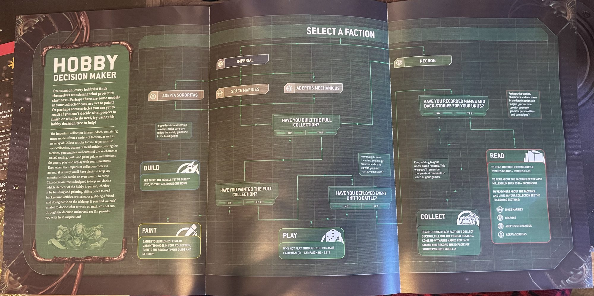Imperium Hobby Decision Maker. Credit: Hachette Partworks and Games WorkshopLastly, we have a foldout with a map of the Ramasus System, the place we've been fighting for all this time. It's been Derek's Mom's Dining Table IV for me, but Warhammer is all about making your own stories, stupid ones. Surrounding this are pages with little blurbs for Necron or Imperial victories in this campaign, but overleaf is a flowchart for planning your hobby progress, pictured here. The green on green (on green) design is visually cohesive while being somewhat hard to read, but more importantly it lays out a structure for how we should tackle our collections. This is interesting to me because it is not strictly a document of instruction, but one of philosophy. It highlights the multiple ways we can engage with the hobby through an ordered framework, working through steps in sequence until we have completed our Imperium journey. I feel that this should have come much, much earlier in our collection. Setting a framework is easier to do at the outset of a venture rather than at the end, but ideally hobbyists getting into Warhammer through this magazine can take this method with them on their personal hobby journeys. It's also pretty damning that I'm beginning this flowchart with "No" but I'm trying not to take that personally.
