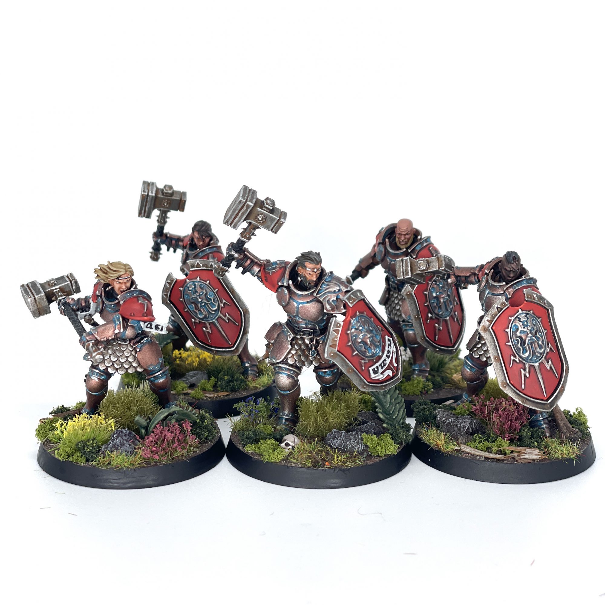 Stormcast Eternals Liberators. Credit: SRMIf you couldn't guess from the trio of lore articles, this issue doesn't contain any new miniatures. It does, however, have a pair of paints: Knight-Questor Flesh and Coelia Greenshade. Knight-Questor Flesh is a pretty solid medium skintone, and I often use it as a highlight for darker skin, or as a base for a medium-dark skintone. Here they show using it to highlight wood, hair, feathers, and, of course, skin. Curiously, Coelia Greenshade isn't used in any of the painting tutorial pages. It's a great color; a versatile green-blue wash that's perfect for giving a dank, mossy feel to rocks or building up a cool toned patina or animal skin.