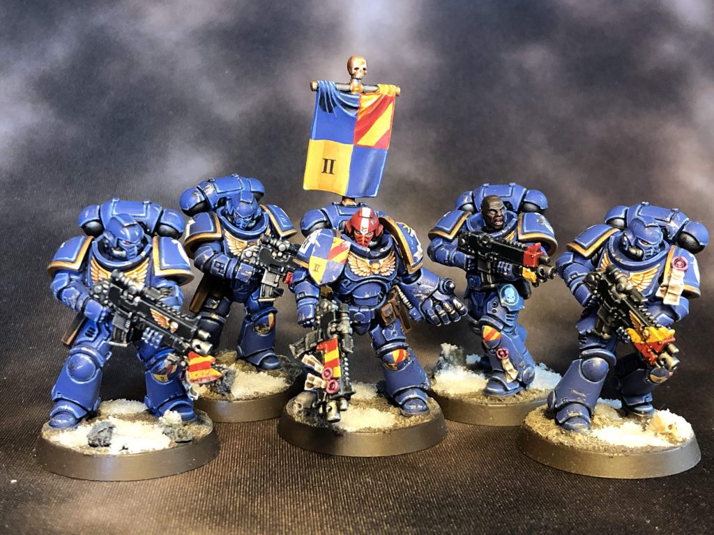 Since taking those pictures, I also found the time to paint another two five man squads of Intercessors to back them up and bring the force up to a Battalion. My general aesthetic for this army is "weathered and modern but with retro flair" and I think I've applied that well to my next two Intercessor squads, including the squad with a banner suspiciously similar to the Purina Dog Chow logo.