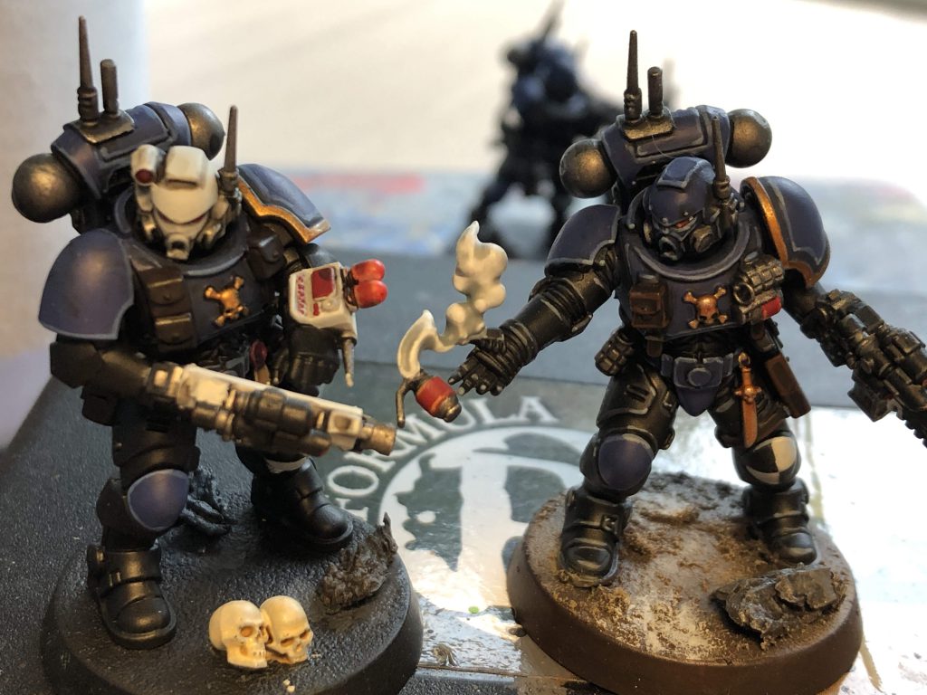While there's still more to do, I can finally paint at home comfortably again. No more library painting for this fella! I even got to play with some Contrast paints, which I tested on the vials and smoke of these two Infiltrators: