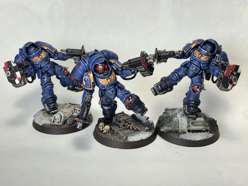 Black Templars Hellblasters. Credit: SRMThe idea for how I'd build and paint these guys had been scratching away at the inside of my brain case for a couple weeks, and instead of medicating that particular issue I just got to cutting and building. Using the last of my Assault Intercessor sprues from Indomitus, I cut off the guideposts and stuck on a set of Hellblaster arms I'd been holding onto. At one point I had the plan to convert my second unit of Ultramarines Dark Imperium Inceptors to have the assault plasma doohickeys, as the box set plasma weapons look like Supersoakers. Instead I stuck with the assault bolters and held onto those plasma guns for actual factual years.