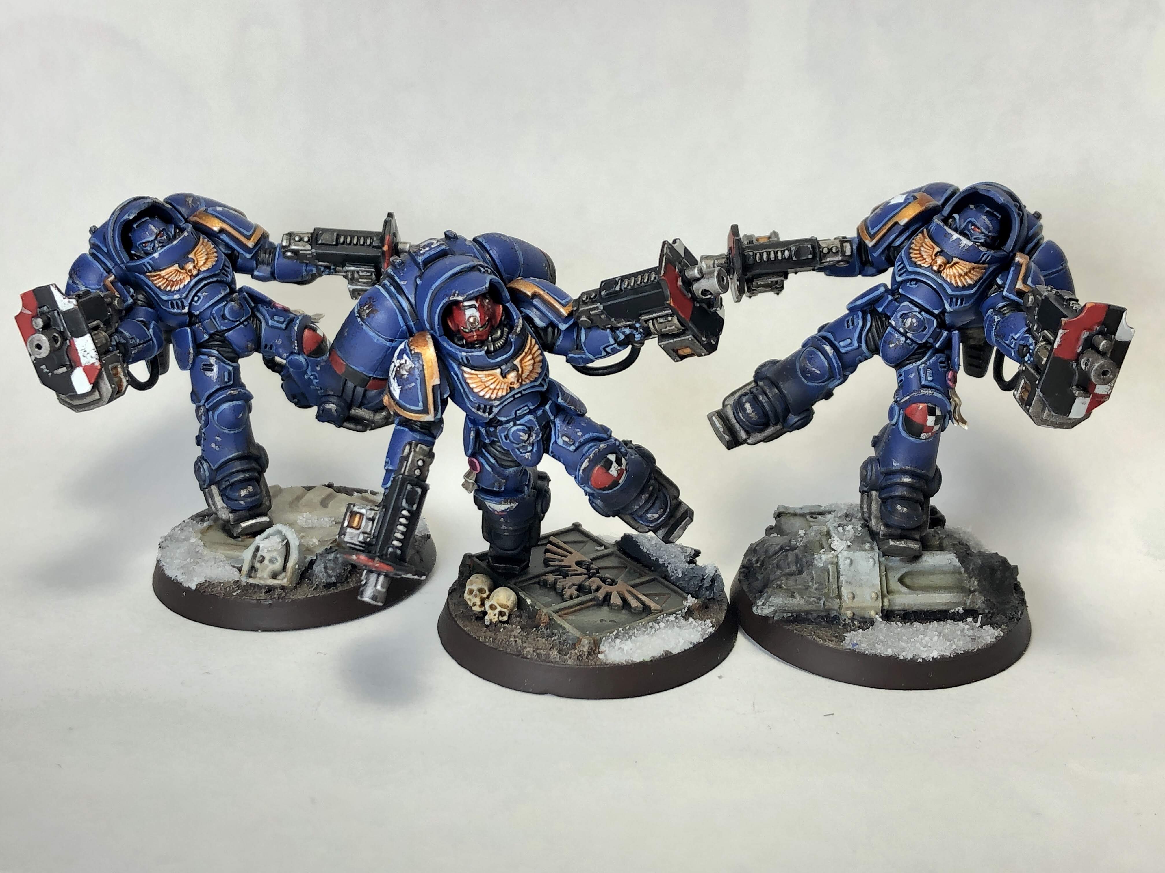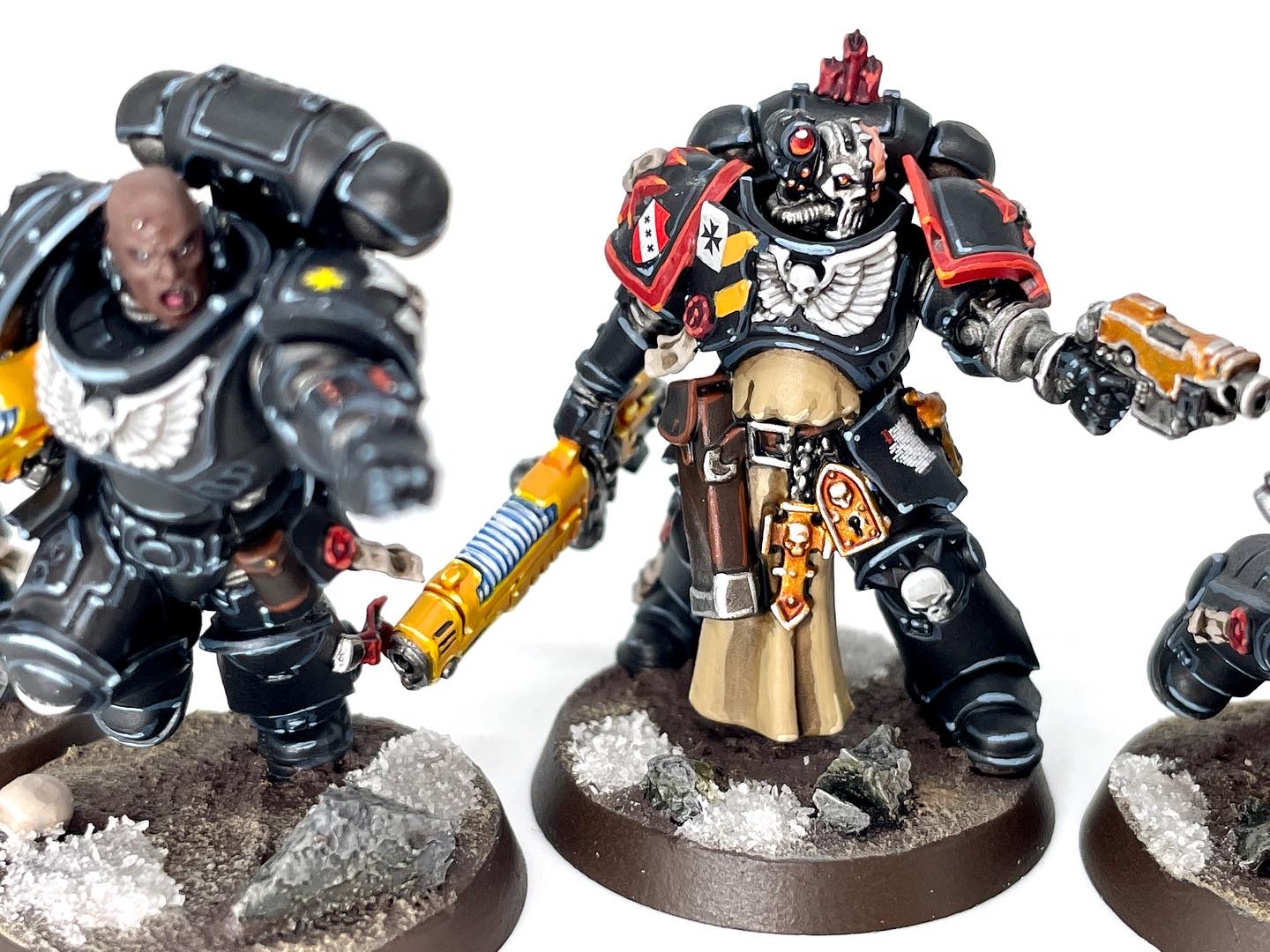 Black Templars. Credit: SRMThis is where the superstitious part of my brain can say that it was just Newly Painted Model Syndrome and that after that shameful showing, it's easy street from here on out. Unfortunately, the rest of my army has also been suffering from extremely late-onset Newly Painted Model Syndrome. In my last game pretty much everything underperformed, so imagine my relief when I talked to Rob about the units in my painting que and heard they were, in no uncertain terms, bupkis. Regardless, at this point I was already about 60% done painting a unit of Primaris Hellblasters, and to quote one of the random Dawn of War barks, a task unfinished is a prayer unanswered.
