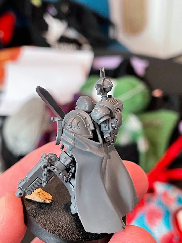 These models are real dang complicated for Space Marines. I've been playing 40k for 17 years now and these are probably the most complex Marine infantry I've ever put together. Each took me like 40 minutes to build, and there are roughly 15-20 pieces per model, depending on details. Lining up their shackled wrists and threading sword hilts through chains is tricky but nothing a fairly experienced modeler can't do. The frustrating part is their capes, which can't really be left off to be painted separately due to the way they wrap around and under various parts of the model. You also need to line up joins on the cape that really, really don't want to join and don't have any strong guides. There are these little divots that theoretically slot over the details on their pauldrons, but said pauldrons have no guides to put them in a specific position. There's no guarantee you'll use the exact pauldron it's asking for, so they're never going to fit quite right. As a result, I had to use ample amounts of dummy thicc plastic glue to fill the gaps to middling results.