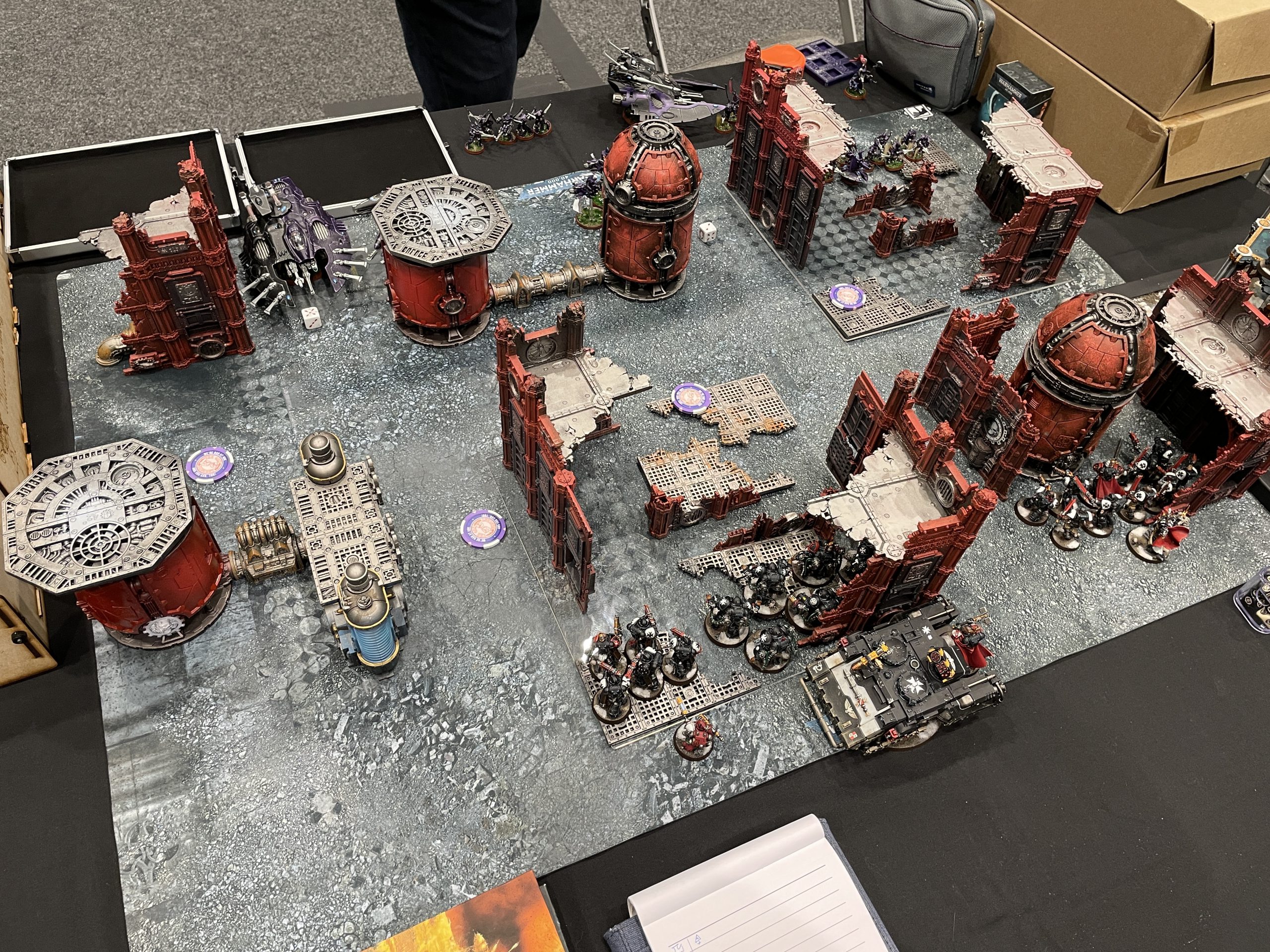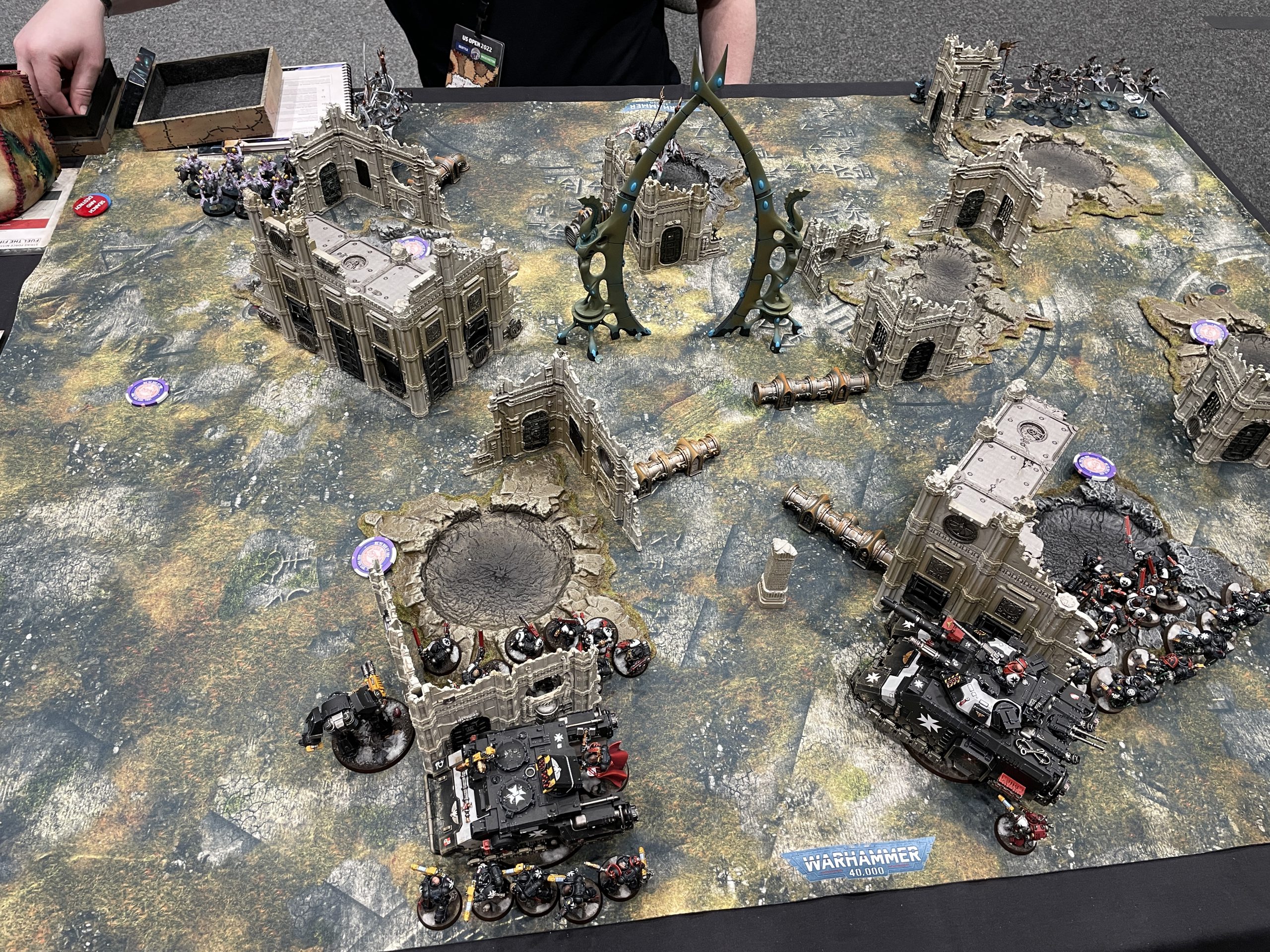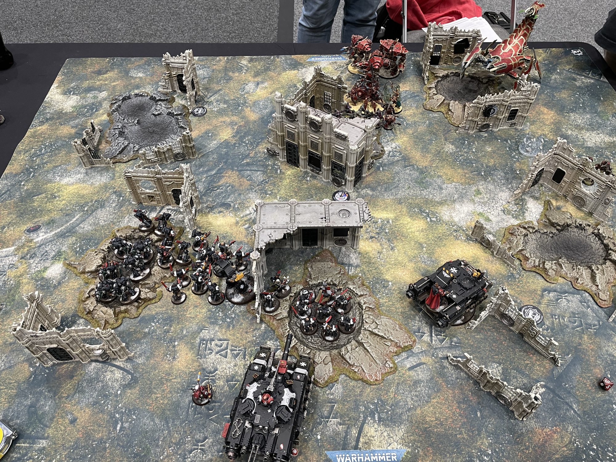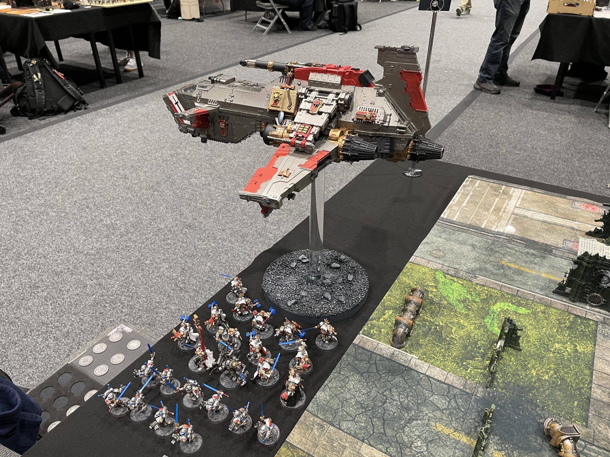 I did a few circuits of the gaming hall, checked in on games by other Goonhammer folks, and scoped out the armies around the event. While there was the expected smatterings of Tyranids, Tau, Eldar, Grey Knights, and Thousand Sons, some wildcards actually brought armies that were sick as hell. There was an all-Kroot army, some real dang cool Knights stomping around, no fewer than three Guard players with Baneblade chassis vehicles, and one absolute mad lad with a Grey Knights Thunderhawk. I checked in on him multiple times during the event and gave him a Badcast Bizcard. I don't think he won a single game but he was living his best life.