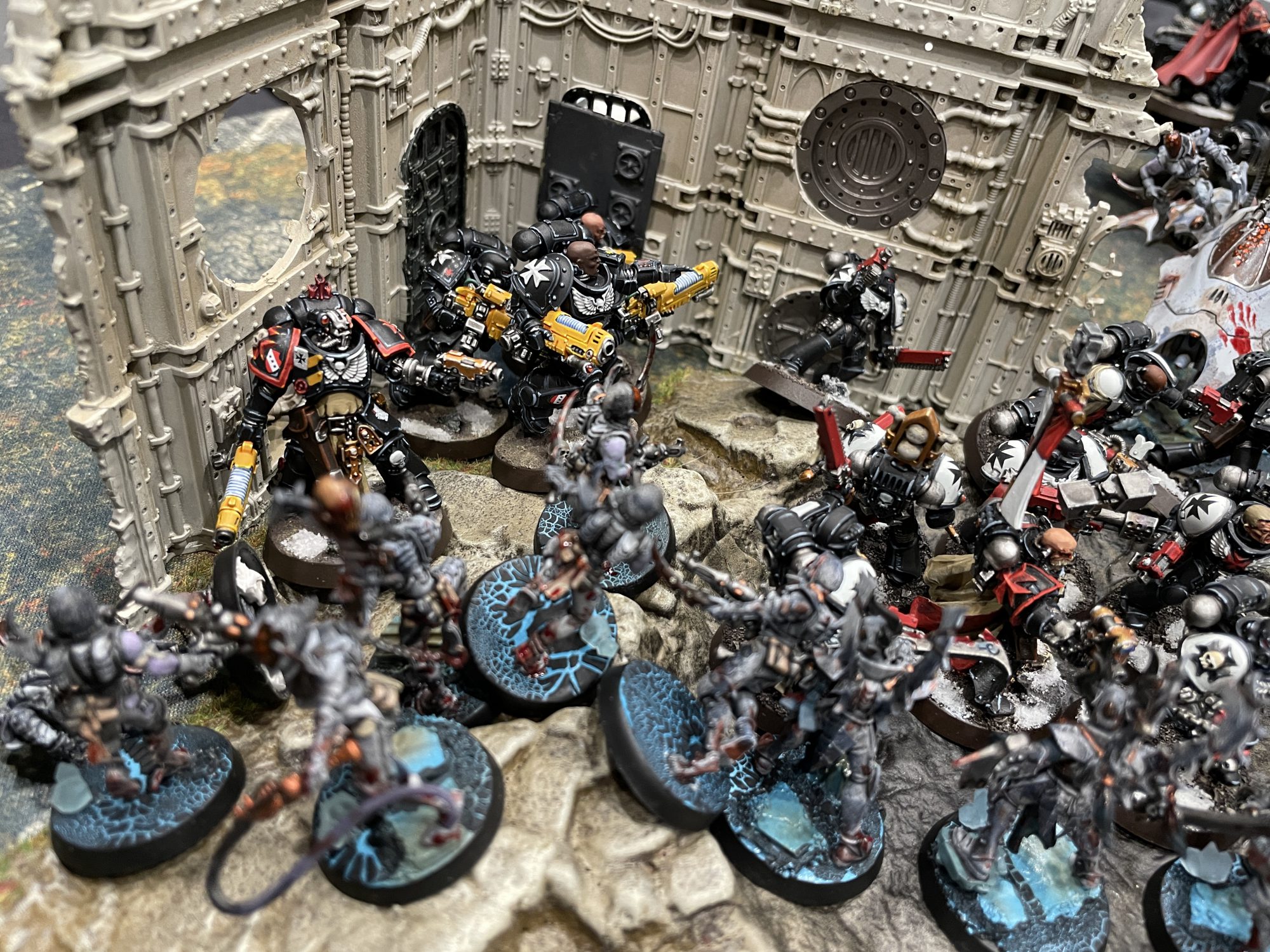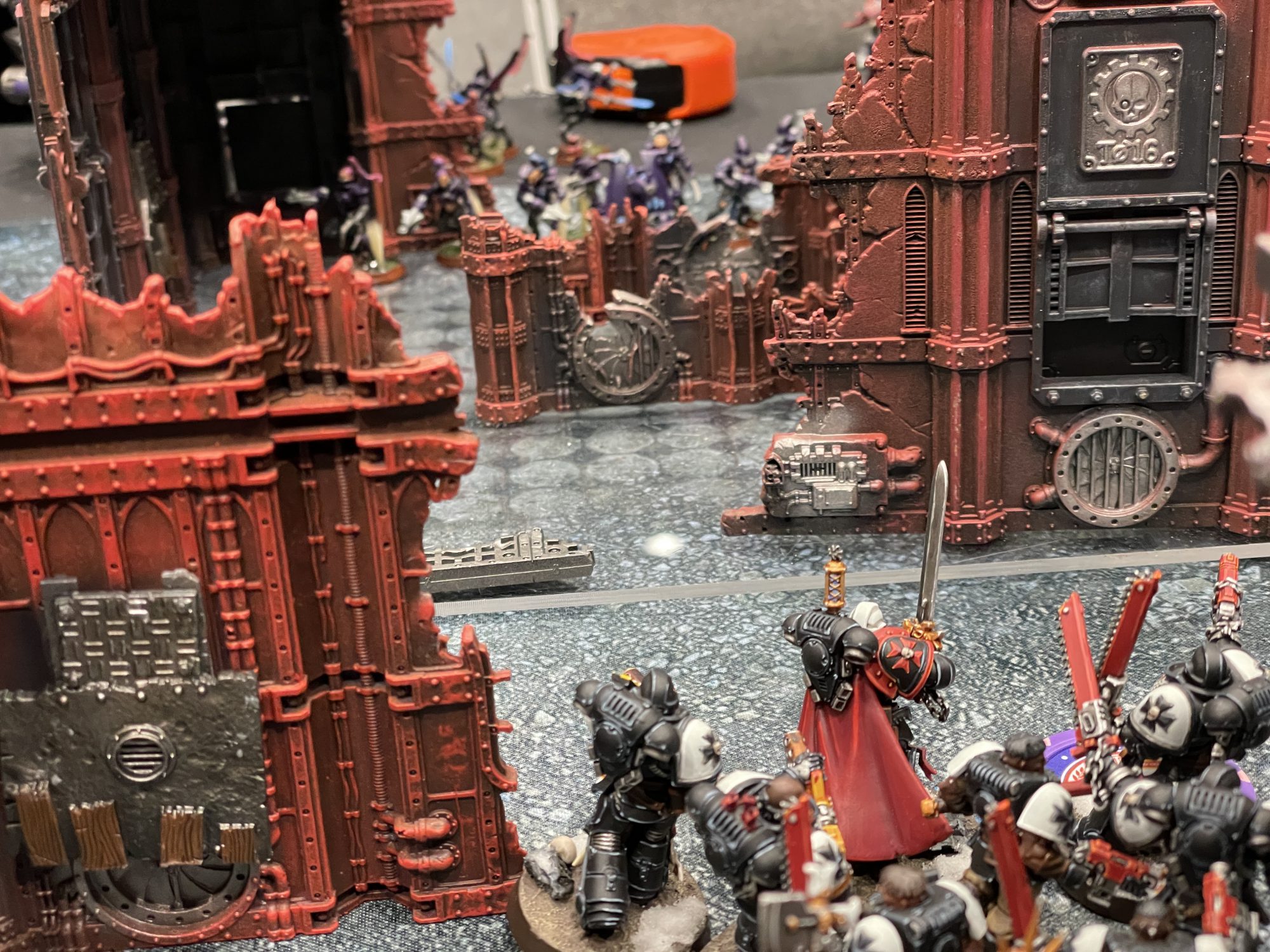Black Templars vs. Admech. Credit: SRM and PendulinMy first game of the event proper was against Goonhammer's own Pendulin, whose Administratum tool had made this entire Crusade possible for me. A quick note on Pendulin - he is one of the most infectiously enthusiastic people I've met in my time in this hobby, and an absolute delightful human being, kind of like a human border collie. In our 50PL game, we were on a table with two big boxes of Ork ruins that were extremely easy to hide in. He had Admech with a comically skewed 6 Kastellan Robots and a smattering of cheaper units supporting them. Turn 1 he yeets them across the table with a Veil of Darkness-adjacent ability and wipes my Aggressors, and his Ruststalkers charge into my Orky house and kill my Intercessors. Wholly hemmed into my deployment zone, I kill the rusty bois and hide in the house, where the robots can neither see nor enter. The problem is, I'm already gaining infamy and I can't score in this building, so it's either run out the clock and lose or charge forward in a glorious Charge of the Light Brigade-esque forlorn hope. Buddy, I've listened to Trooper in the triple digits at this point in my life, so you bet your keister I charged out of that building.