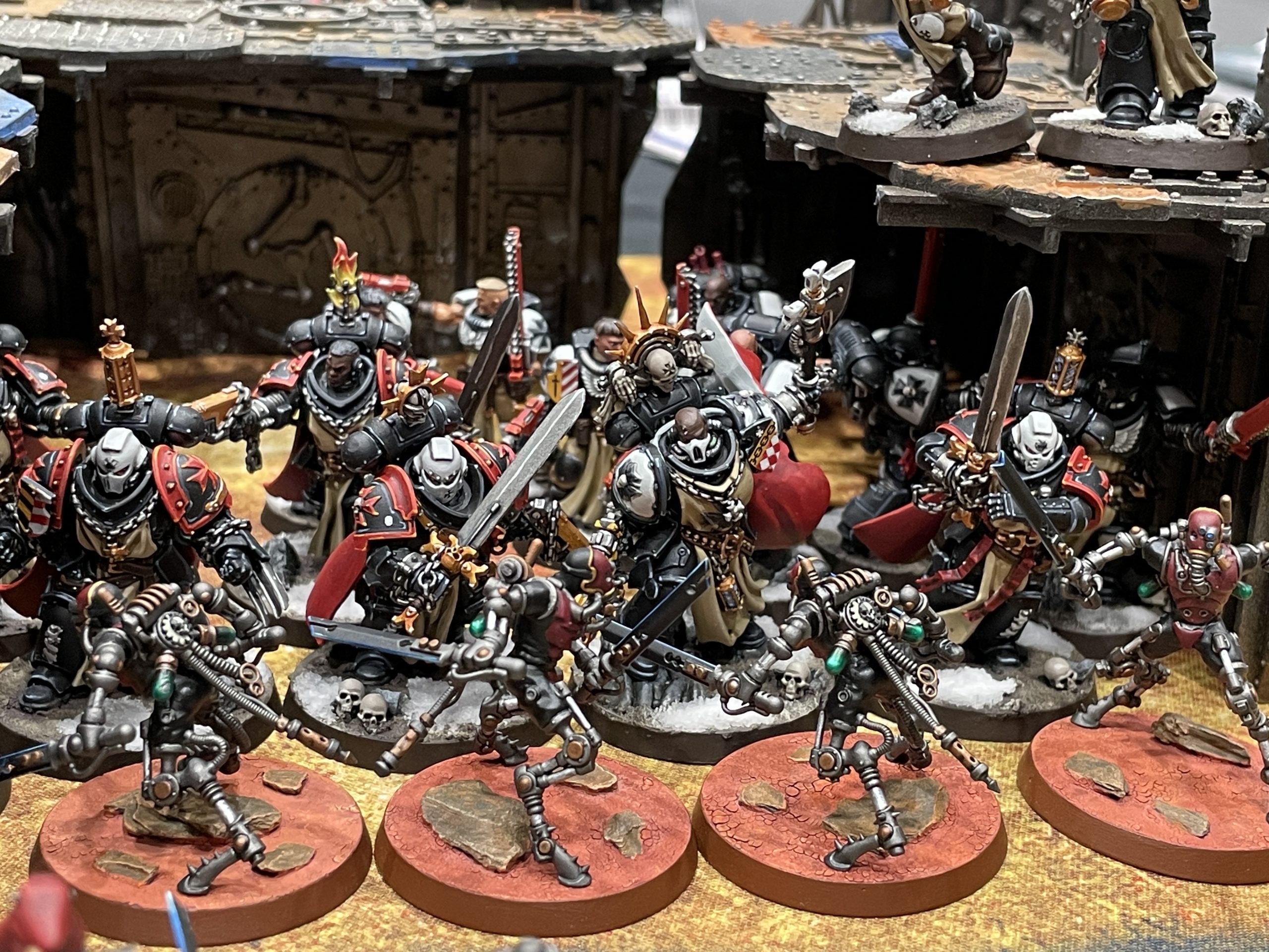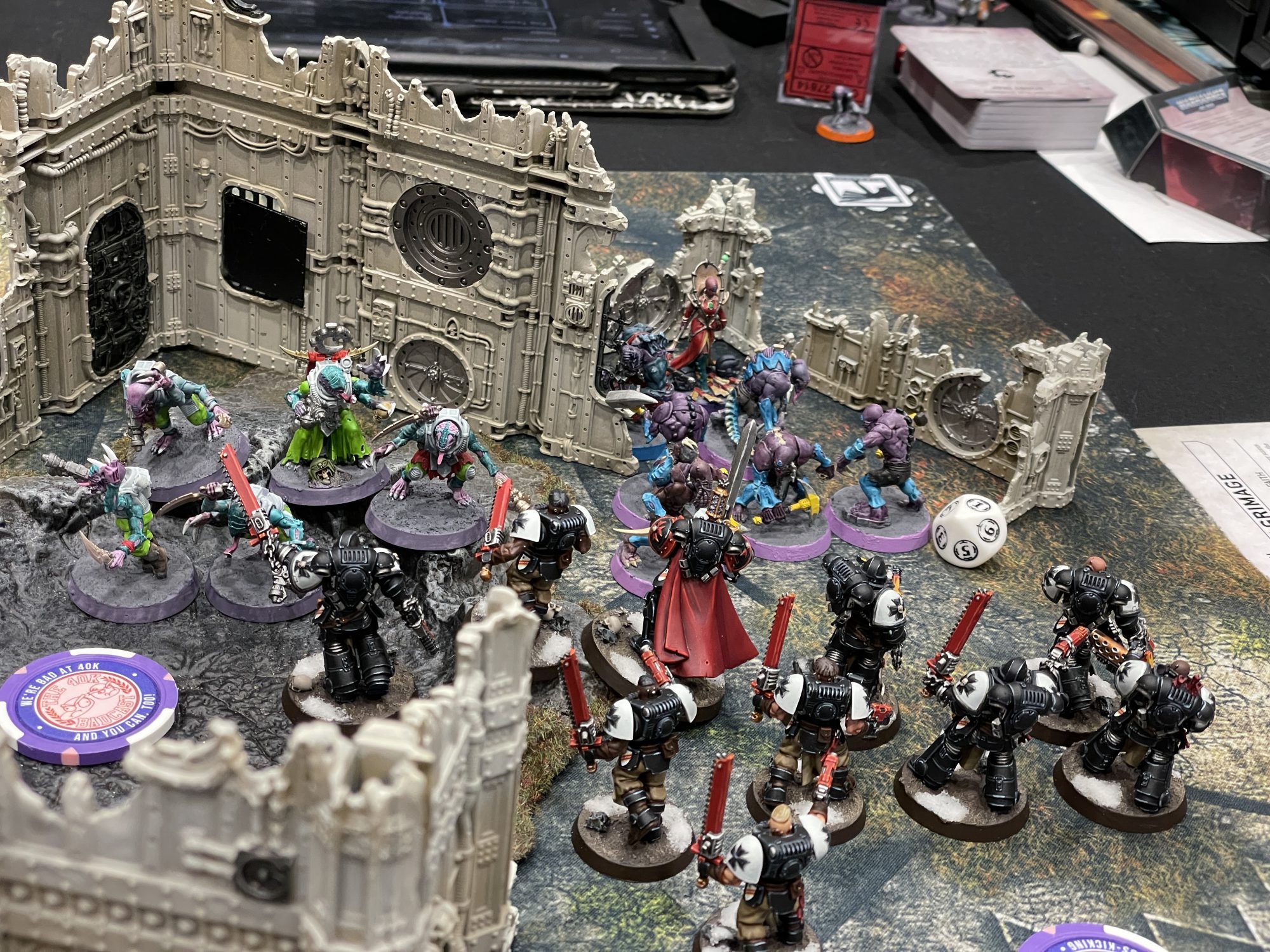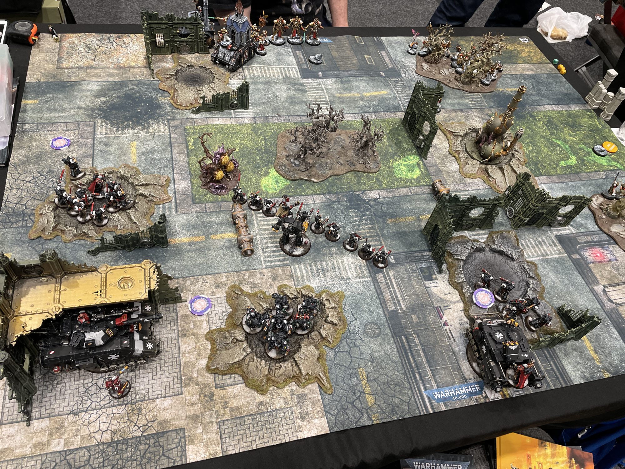 Black Templars vs. Genestealer Cults. Credit: SRM and MaxMy first game of the day was with Max, a Tacoma local and Goonhammer reader. Sup bud. He had Genestealer Cults, an army I hadn't played since Adepticon 2019, but with much smaller Black Templars. I baited a multi-unit charge with my Primaris Crusaders and tanked most of his army with Transhuman Physiology and some good save rolls. While they held up the heavy hitters, my Aggressors and Intercessors wiped out his infantry, and my Impulsor point-blank vaporized his Cult Primus with a multimelta. I tabled him on turn 3, but he was an absolutely delightful opponent and we're friends now.