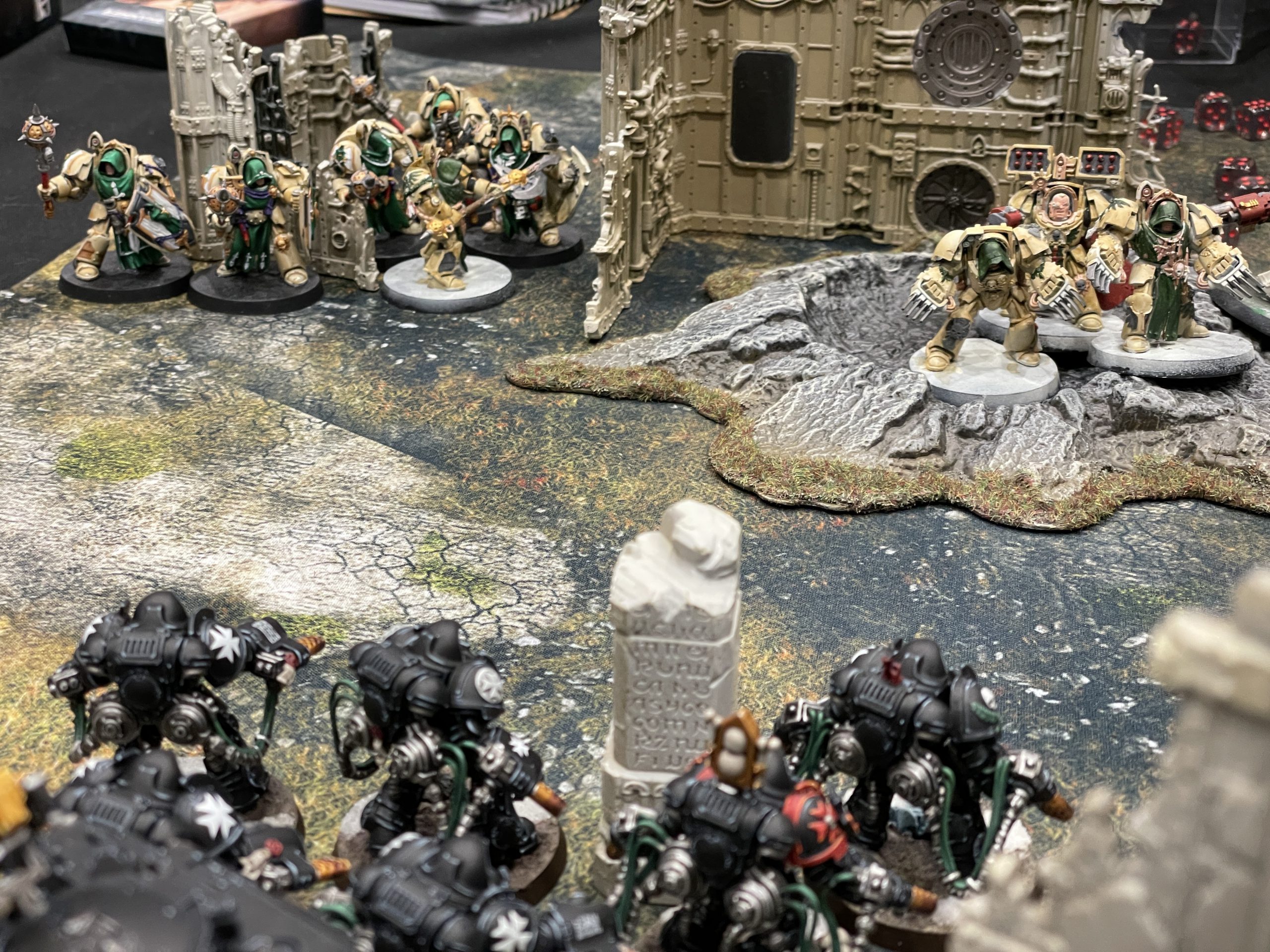 Black Templars vs. Iron Warriors. Credit: SRM and RowanThe mission had 5 objectives spread across the midfield and his deployment zone, and he would score a low amount of points gradually as the game went on. As the attacker, I could burn these objectives with a remarkably easy action and score huge in the endgame. The problem with this is at only 4 points per objective per turn for the defender, the attacker can automatically win on turn 1 if they can just get a trio of units into the midfield. With an averagely fast army, it took me until turn 2 to win. I decided not to tell him this fact as he was visibly feeling down from my turn 1 fusillade and I wanted us to get a whole game in. I wasn't about to suck the wind out of his sails right when his Brass Scorpion was starting to wreck shop, and I really wanted to kill that 5lbs resin arachnid. I don't like this mission, as even for something that doesn't have to be as balanced, it still feels bad to effectively lose immediately. It all but confirms that Crusade missions aren't playtested as much as Matched Play missions, and makes me even wonder if they're playtested at all.