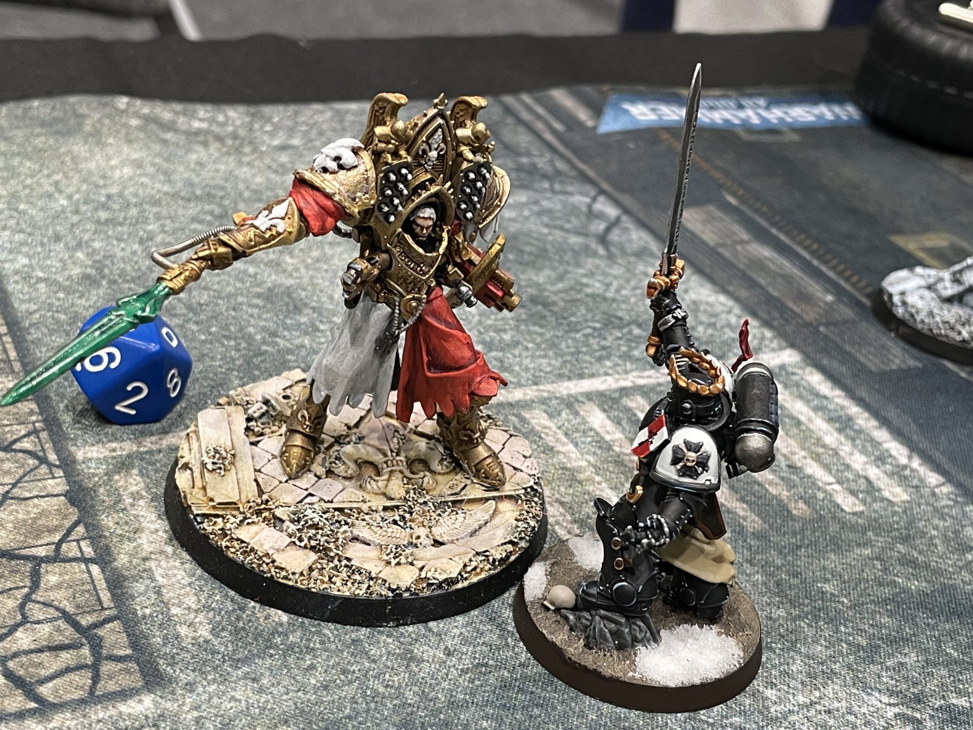 Black Templars vs. Sisters. Credit: SRM and GregGame 5 was against a dadgamer named Greg and his Sisters. This was my only game against a non-listener/non-Goonhammer reader of the entire event, and he was an absolute delight. Maybe there's correlation there. His list was a broad smattering of largely footbound Sisters units, replete with Morvenn Vahl, Ephrael Stern, and her little elf buddy. Turn 1 was unproductive, with me moving up the table and doing some damage to his Rhinos, or "Shrinos" as he cutely called them due to the churches on their backs. He only killed a single Crusader in return, which opened me up to start charging away on turn 2. My Crusaders and Primaris Crusaders tied up most of his army while my heavier hitters moved on in. While my Crusaders both got whittled down I returned the favor to the rest of his army.