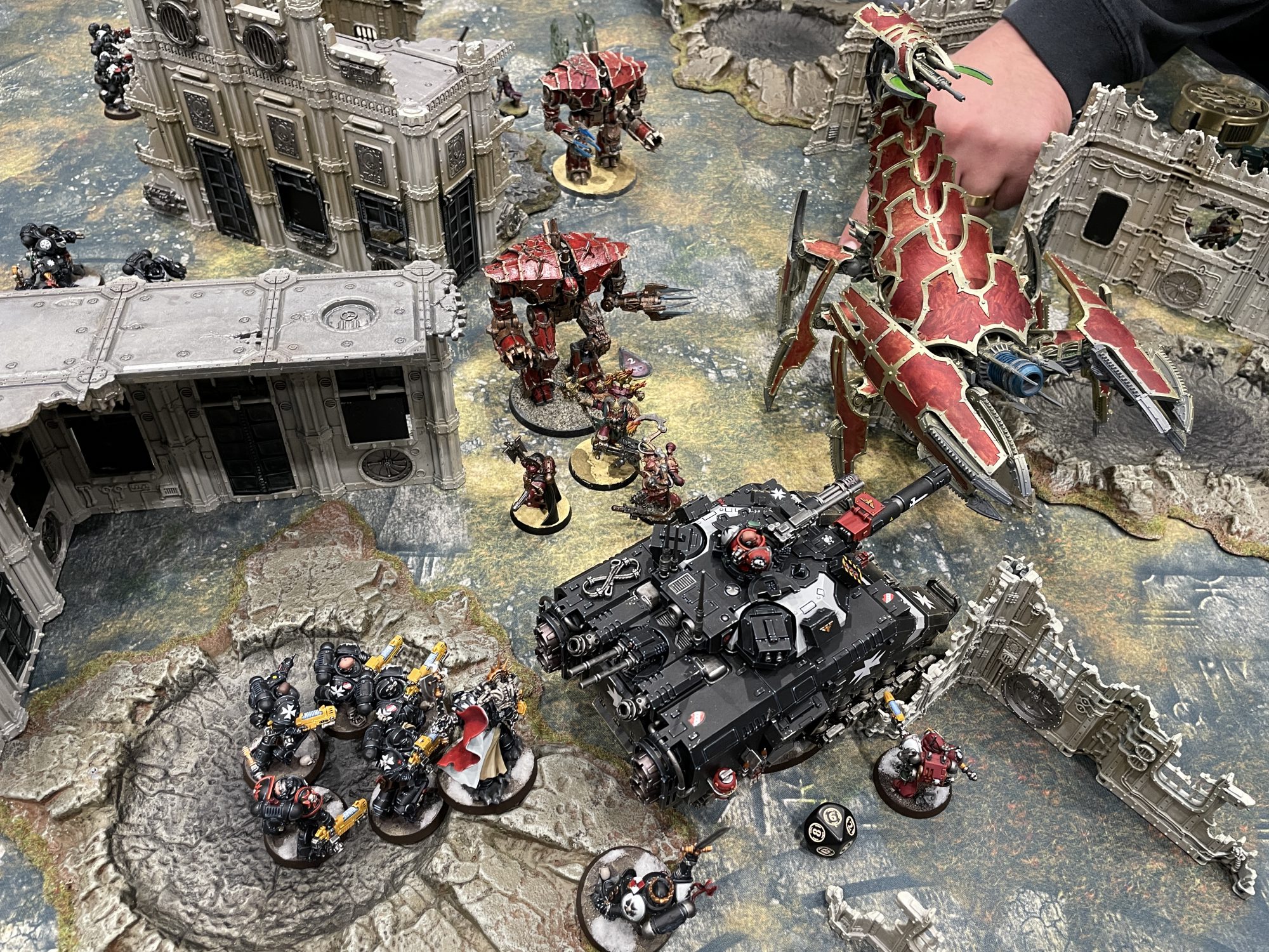 Black Templars vs. Dark Eldar. Credit: SRM and PerryTurn 1 was pretty low-yield for both of us even with him going first, with poor damage rolls on his part and good saves on mine. I positioned around that Gate and was able to limit his charge targets somewhat, making it a smidge easier to weather that turn 2 storm of assaults. With some canny use of Vicious Riposte to trade my smol Crusaders for his Incubi, I got to start my turn 2 off right and my Repulsor Executioner started wiping out like 3 units a turn. I kept my Emperor's Champion in my Impulsor while his co-passengers the Primaris Sword Brethren ran out, and naturally when that Impulsor got blown up next turn the Champion went with it. Perry also failed a clutch charge with his Clawed Fiends that would have seen him tie up my right flank, so instead I Heretic's Pyred them with my Aggressors and wiped them out with shooting. Lastly, my Repex got to shoot all its small arms fire at his Archon, who promptly failed his first 2++ save and was boltered to death by the following 17 wounds or so. This game was pretty brutal, and we called it after turn 3 as he was running out of models and I was starting to run away with it. Perry and I are friends now, and we hung out a ton more over the weekend.